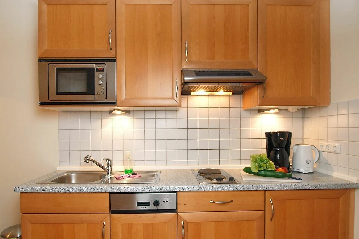 Die zum Wohnbereich angrenzende Küchenzeile ist für Sie mit einem Toaster, einer Mikrowelle, einem Wasserkocher, einer Filterkaffeemaschine, einem Geschirrspüler sowie einem 2-Platten-Kochfeld und einem Kühlschrank mit Gefrierfach voll ausgestattet.