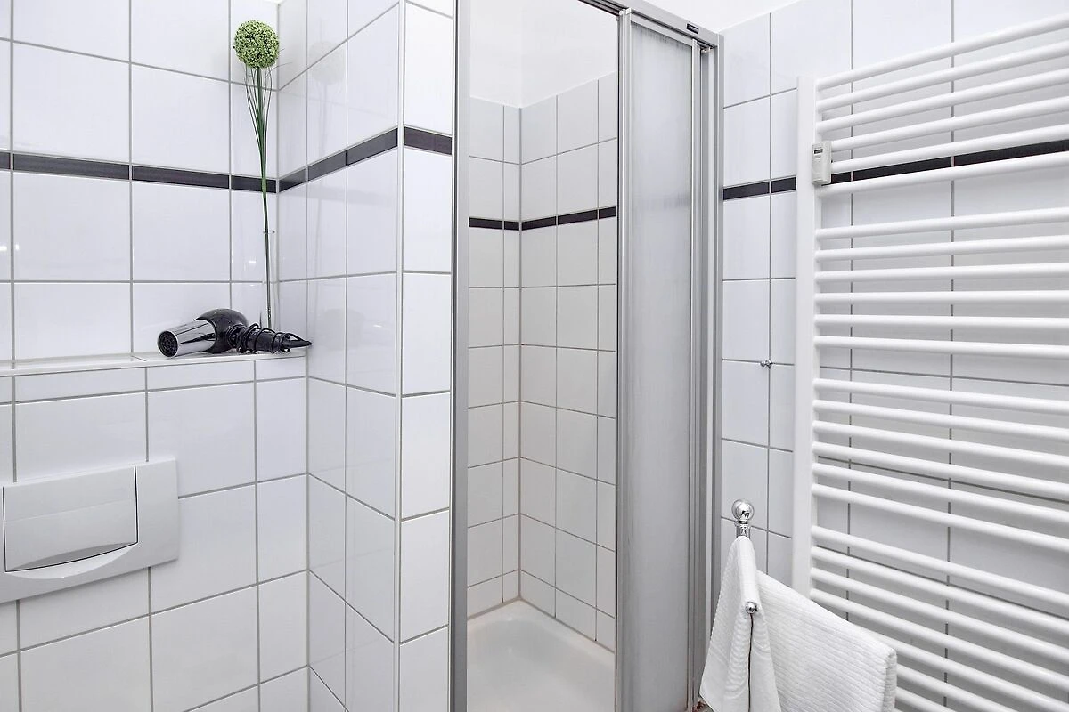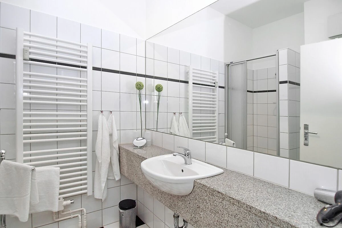 Die Ferienwohnung verfügt über ein Duschbad mit WC. Der großzügige Waschtisch bietet genügend Platz für Ihre Waschutensilien. Ein Föhn, ein elektrischer Handtuchheizkörper und ein Kosmetikspiegel komplettieren die Einrichtung des Bades. Die Wohnung ist mit Design-Belag ausgestattet. Das Bad und der Küchenbereich sind gefliest. In dieser Nichtraucherwohnung sind Haustiere nicht erlaubt.