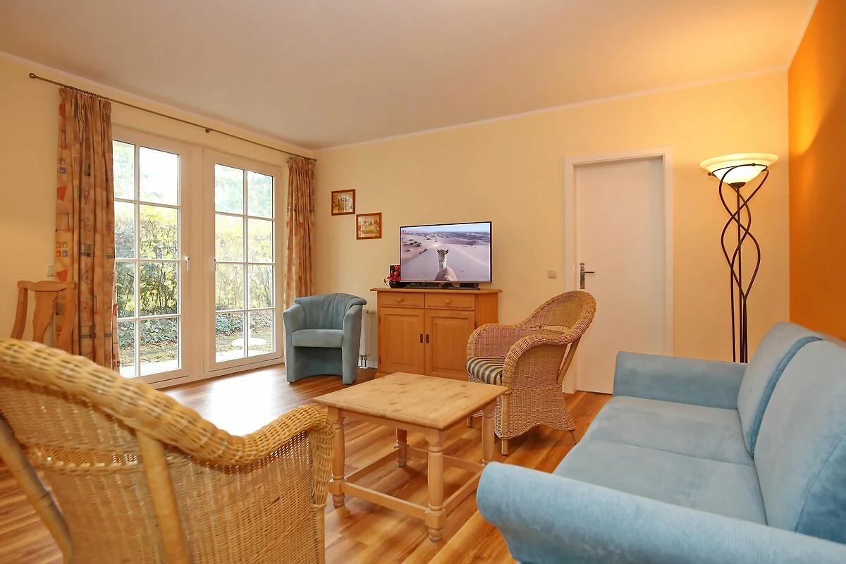 Der Wohnbereich der Ferienwohnung besticht durch seine freundlichen Farben, einer Couch mit Schlaffunktion (180 x 200 cm) – diese bietet Platz für eine Aufbettung für 2 Personen, zwei Korbsesseln sowie einen Couchtisch und einen Flachbild-TV. Der Essbereich bietet dir für 4 Personen genügend Platz für gemeinsame Mahlzeiten.