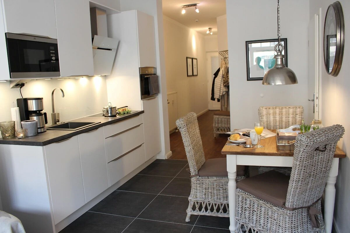 Die exklusive Küchenzeile der Ferienwohnung lässt mit einem Toaster, einem höher eingebauten Backofen, einer Mikrowelle, einem Wasserkocher, einer Filterkaffeemaschine, einem 4-Zonen-Cerankochfeld sowie einem Geschirrspüler und einem Kühlschrank mit Gefrierfach keine Wünsche offen.