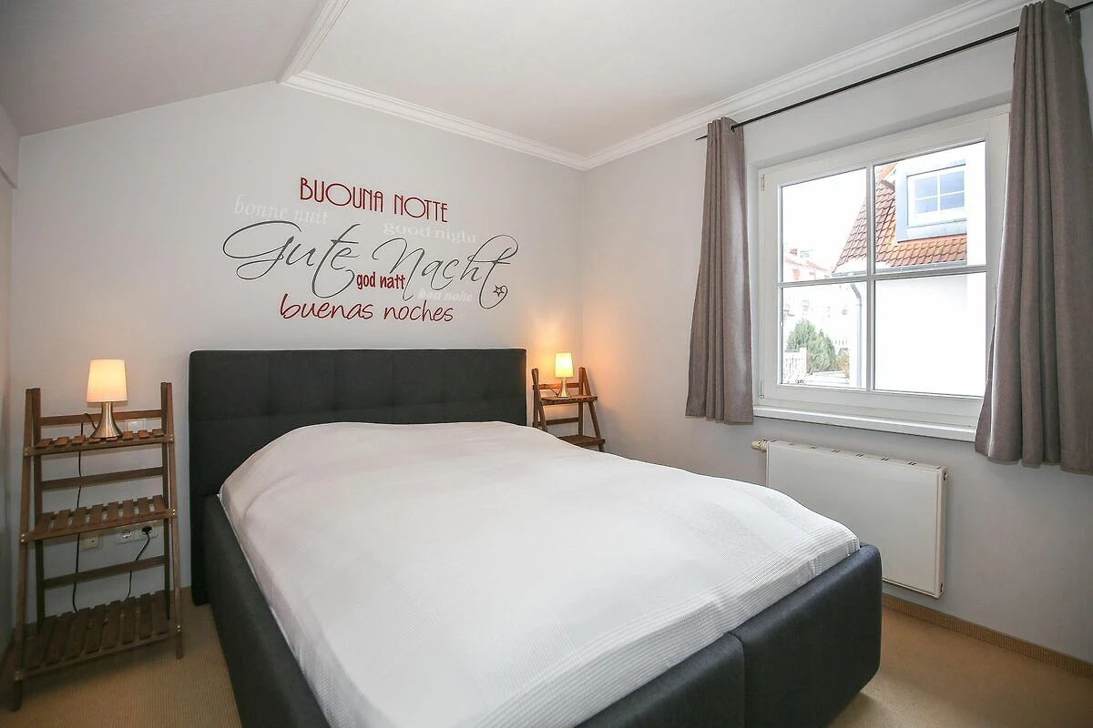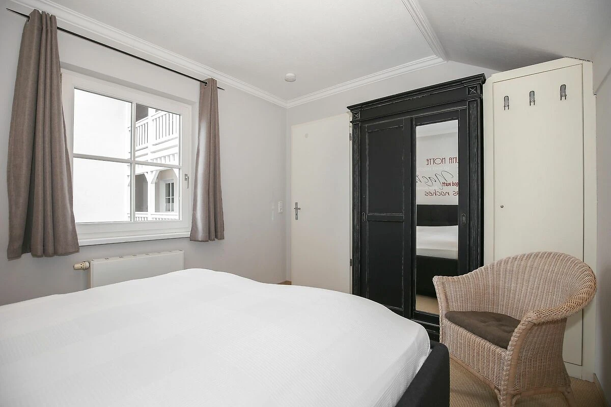 Im Schlafzimmer steht dir ein großes Doppelbett (2 x 80 x 200 cm) zur Verfügung und im geräumigen Schrank hast du ausreichend Stauraum für deine Urlaubsgarderobe. An den Fenstern sind Vorhänge angebracht.