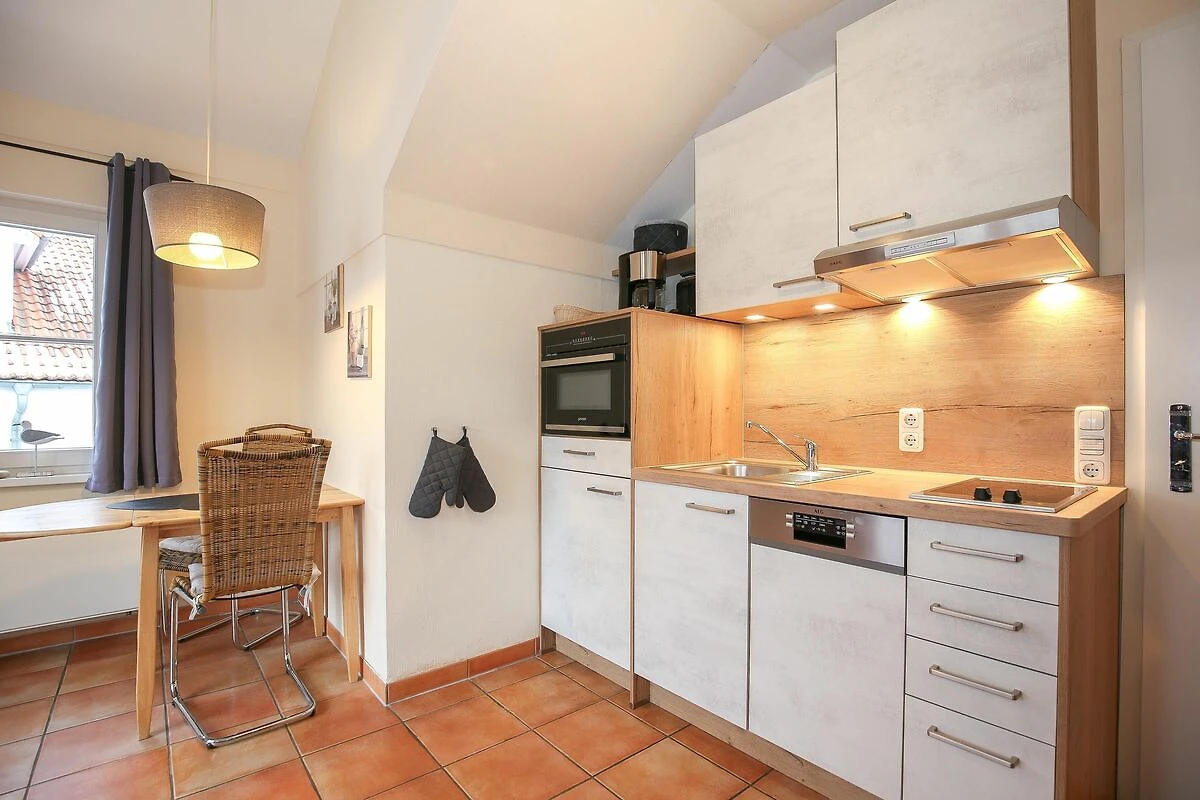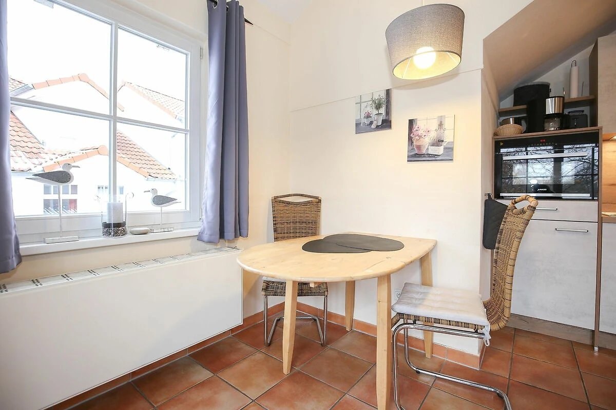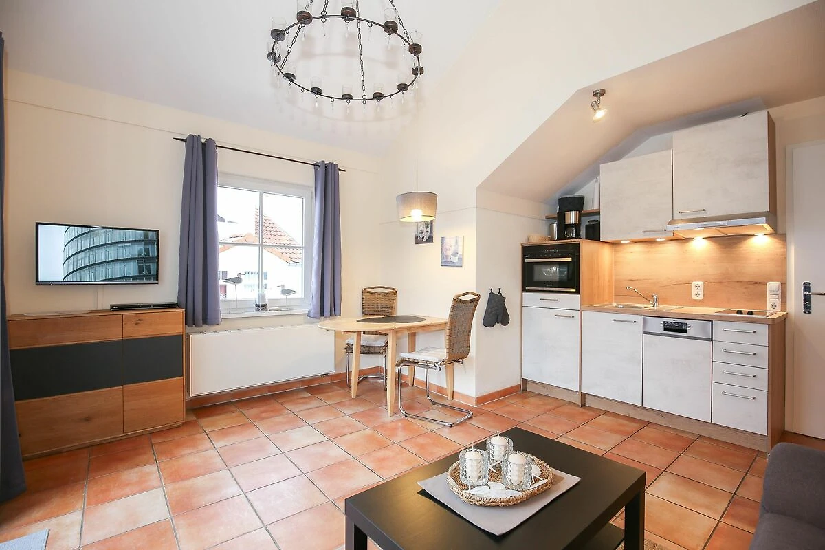 In den Wohnbereich integriert ist die gut ausgestattete Küchenzeile. Diese verfügt über 2 Ceran-Kochfelder, einen Geschirrspüler, eine Mikrowelle, einen Toaster, einen Wasserkocher und eine Kaffeemaschine. Außerdem befindet sich ein Esstisch im Wohnbereich.