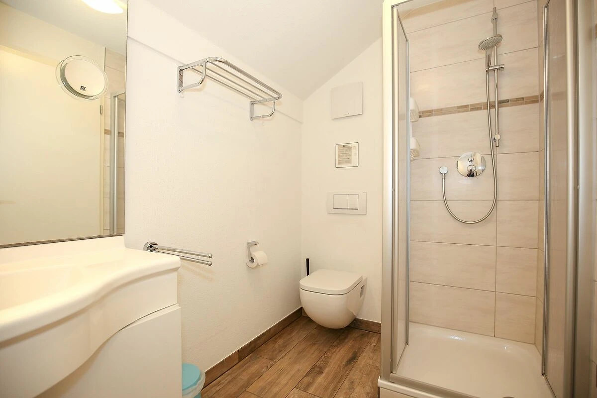 Das innenliegende Duschbad ist ausgestattet mit einem WC, einem Waschbecken und einem großen Spiegel. In der Ferienwohnung wurden Fliesen verlegt. Nur im Schlafzimmer ist ein Teppichboden zu finden.