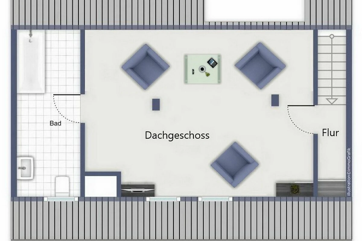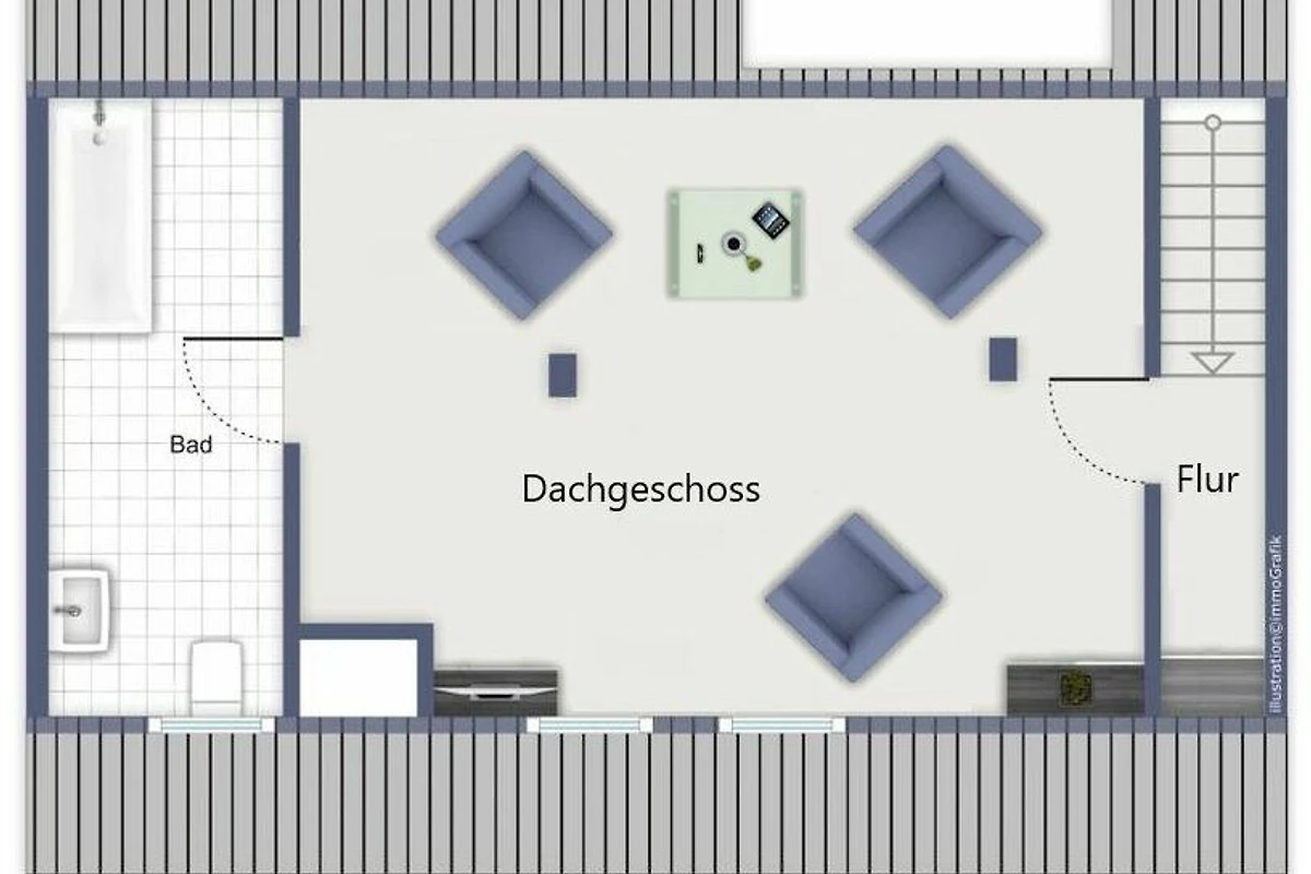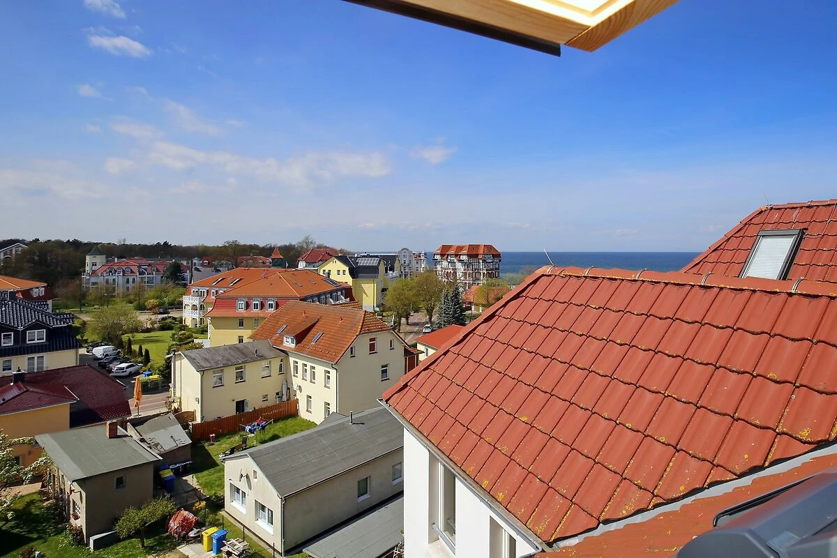 Über die Treppe gelangst du ins ausgebaute Dachgeschoss. Hier steht dir ein zweiter Rückzugsort mit Lesesesseln und einem zweiten Flachbild-TV zur Verfügung. Vom Dachfenster hast du einen weiten Blick über die Dächer von Kühlungsborn West und einen Teilseeblick auf die Ostsee. Im Dachgeschoss befindet sich ein zweites Duschbad/ WC mit einer großzügigen Badewanne.