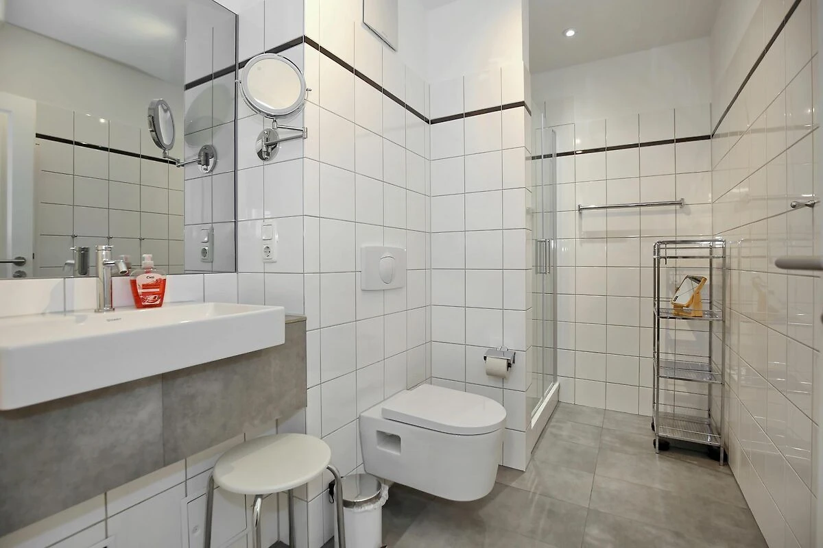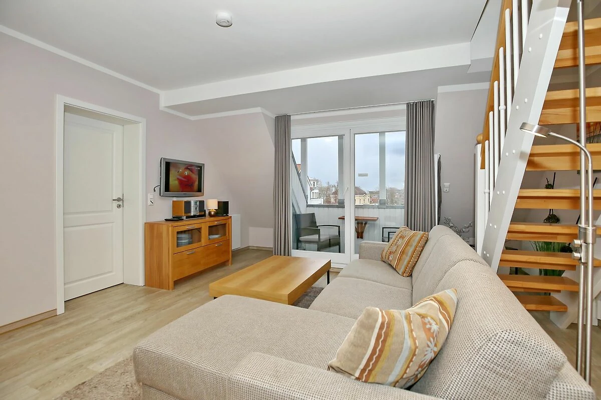 Die Wohnung ist sehr schön und durch die zwei Badezimmer auch mit zwei Pärchen super zu nutzen. Der Balkon ist zwar sehr klein und kann nur zu zweit genutzt werden, aber die Promenade ist so nah,dass dies kein Manko darstellt. Im Hochsommer wird es in dem oberen Zimmer allerdings bestimmt sehr warm, da man die Schrägfenster zwar verdunkeln kann, aber dann lassen sie sich nicht mehr öffnen.