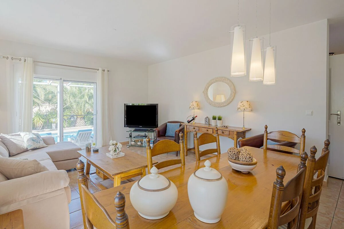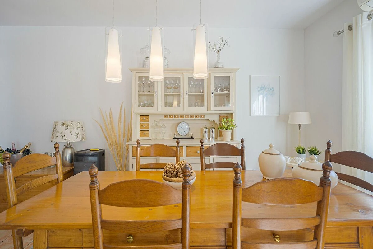Die offene Küche ist mit Backofen und Kühlschrank ausgestattet, während das Wohn-Esszimmer mit Fernseher, Esstisch und gemütlicher Sitzecke punktet. Zwei Schlafzimmer bieten jeweils ein kleines Doppelbett (180 x 200 cm), das dritte verfügt über zwei Einzelbetten – ideal für Kinder oder Freunde. Das Haus verfügt außerdem über zwei Badezimmer: eines mit Badewanne und eines mit Dusche. Draußen erwarten Sie der private Pool, der Grillplatz, der Sonnenschirm und die Terrasse – ideal zum Sonnenbaden oder Essen im Freien. Parkplätze stehen vor Ort zur Verfügung.