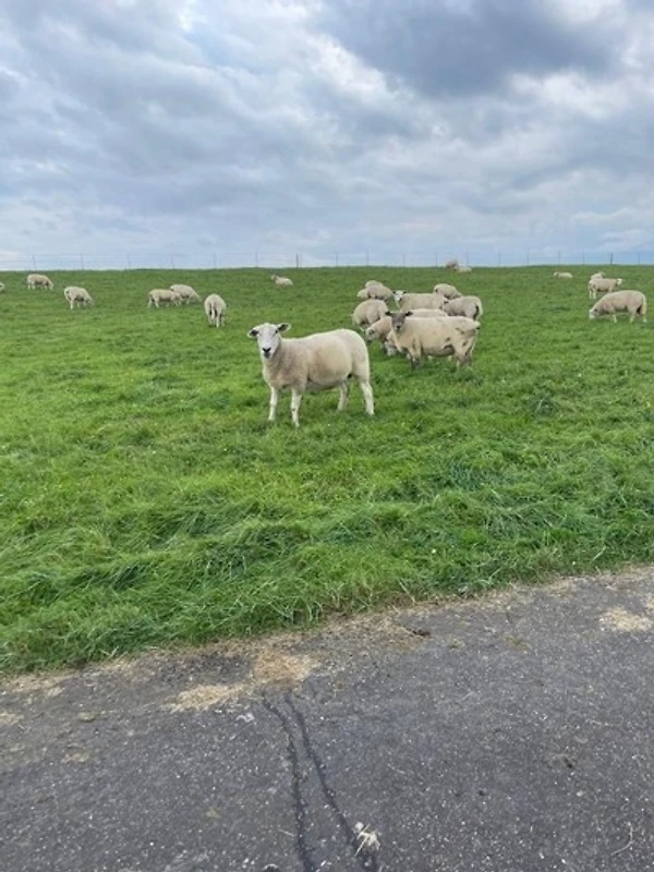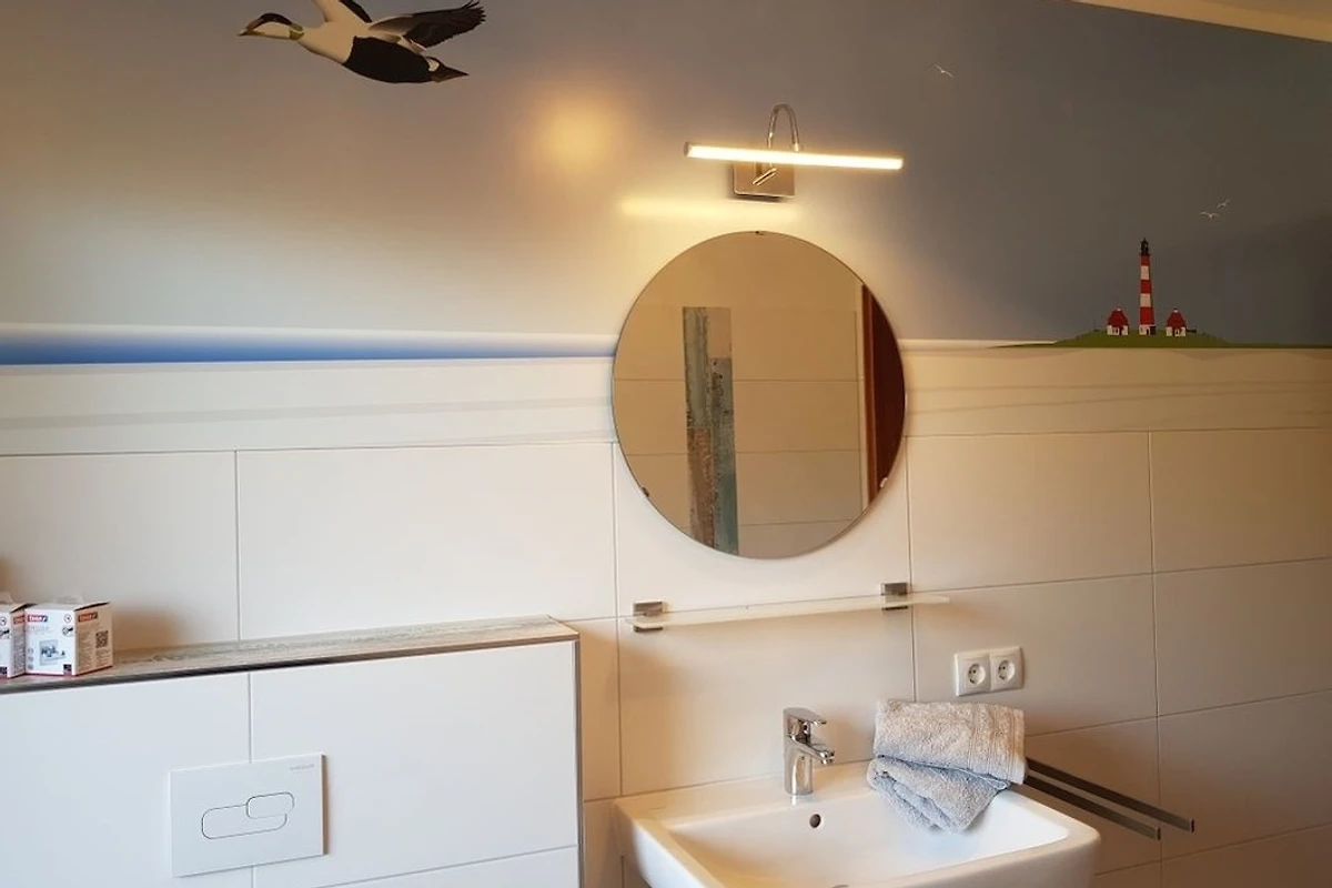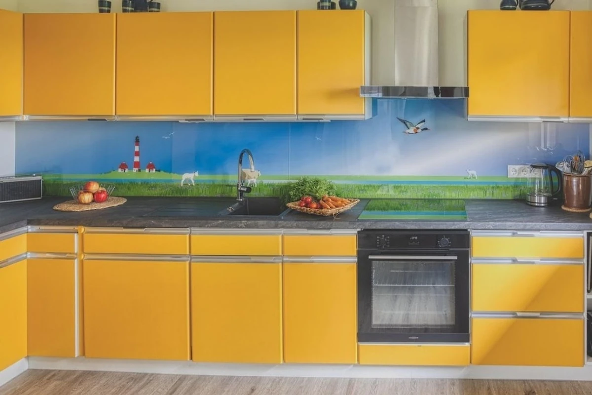 Direk am Esszimmer schliesst sich eine geräumige retrofarbene Küche mit Spülmaschine, Herd (Induktion) mit Backofen und Dunstabzughaube, einen Kühlschrank mit Gefriermöglichkeit sowie Kaffeemaschine, Toaster und Wasserkocher, TM 5 an. Ein besonderer Hingucker ist die gestaltete Rückwand mit typischen Motiven unserer Urlaubsregion wie den Westerhever Leuchtturm, Schafen, Lämmer, Deichen und das Meer.