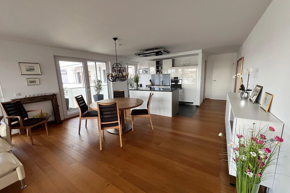 Die Wohnung ist so aufgeteilt, dass die Schlaf- und Badezimmer jeweils von Wohnzimmer mit offener Küche und Essplatz getrennt sind.