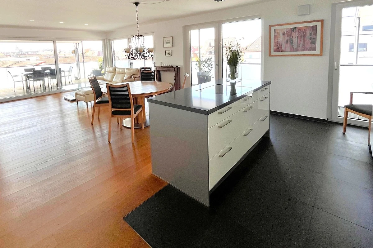 Die Küche mit Kochinsel mit 4 Platten-Herd (Induktion) sowie Backofen, Kühlschrank, Spülmaschine lässt das Zubereiten jeglicher Mahlzeiten zu. Sie finden aber in unmittelbarer Nachbarschaft Cafés, Kneipen, Imbisse, Bars und Restaurants.
