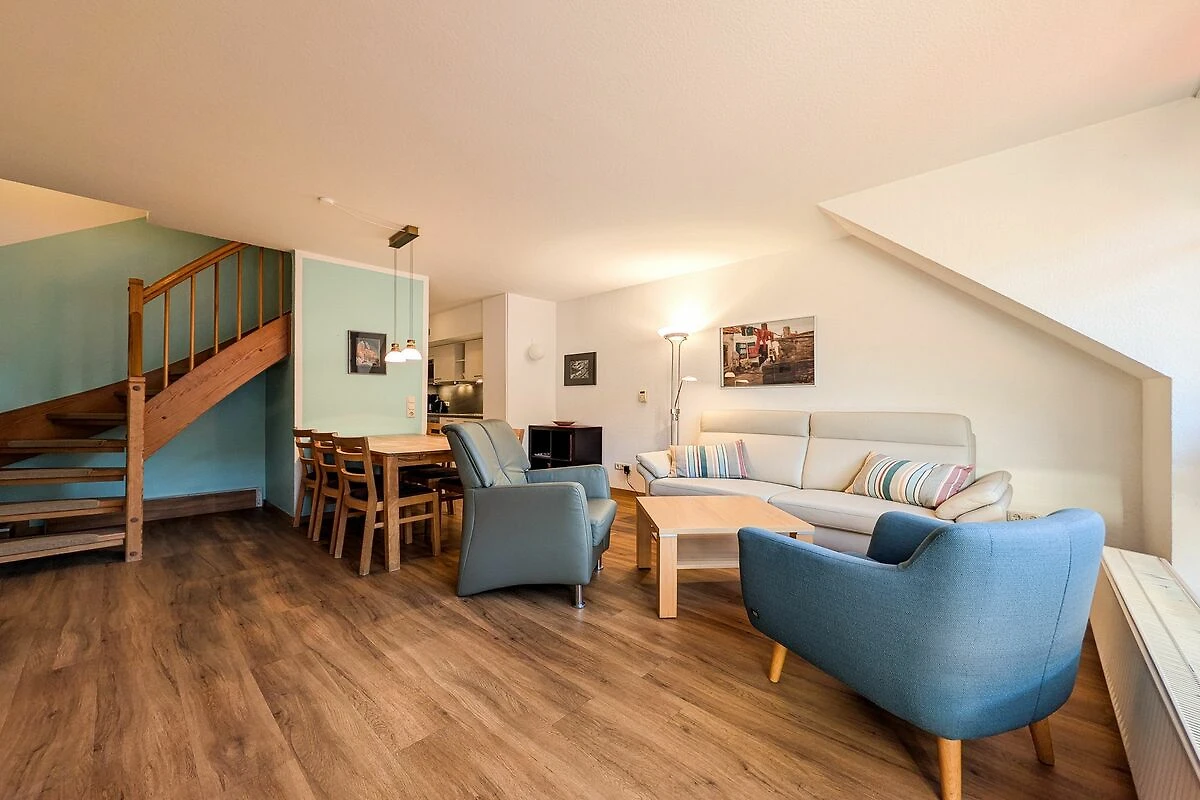In der Küchenzeile befinden sich ein Geschirrspüler, ein 4-Plattenkochfeld, ein Backofen und ein Kühlschrank mit Gefrierfach. Als möglicher Stauraum dient der Schrank im Eingangsbereich. Über eine innenliegende Treppe erreichst du das Dachgeschoss.