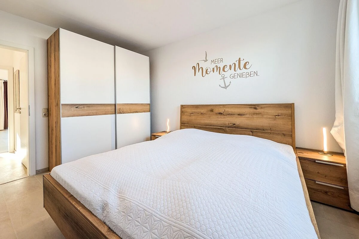 Ein Schlafzimmer mit einem Doppelbett (2 x 90 x 200 cm) und einem Kleiderschrank lädt zum Träumen ein. Die Fenster werden hierzu mit Vorhängen verdunkelt.