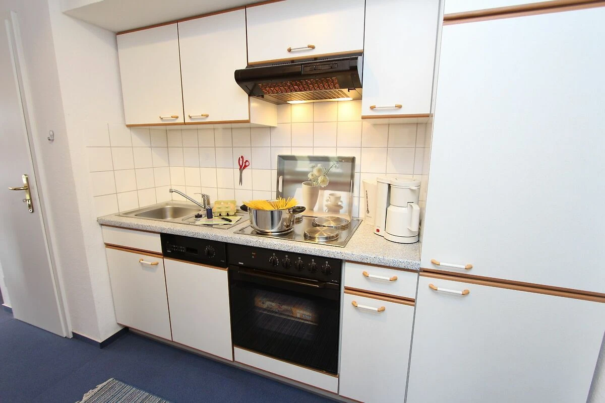 In der integrierten Küchenzeile sind ein 4-Plattenkochfeld, Backofen, Geschirrspüler, Kühlschrank mit Gefrierfach, Espressomaschine und Mikrowelle vorhanden. Hinweis für Allergiker: als Bodenbelag wurde in der gesamten Wohnung Teppich gewählt.