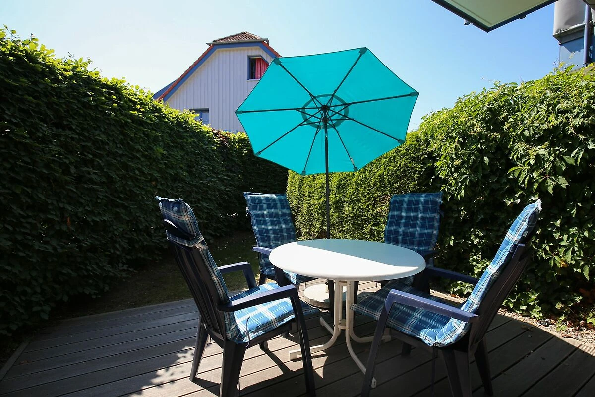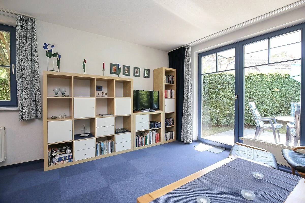 Die Terrasse schließt sich direkt dem Wohn- und Essbereich an und ist mit Liegestuhl, vier Sesseln mit Auflagen, Tisch und Sonnenschirm möbliert. Der Wohnbereich ist mit gemütlichem Schlafsofa (140 x 200 cm), Relax-Sessel und Essecke offen gestaltet. Zur Ausstattung gehören ein Flachbild-TV, ein DVD-Player, eine Stereoanlage mit USB-Anschluss und Dockingstation, sowie eine kleine Auswahl an DVDs, CDs und Büchern.
