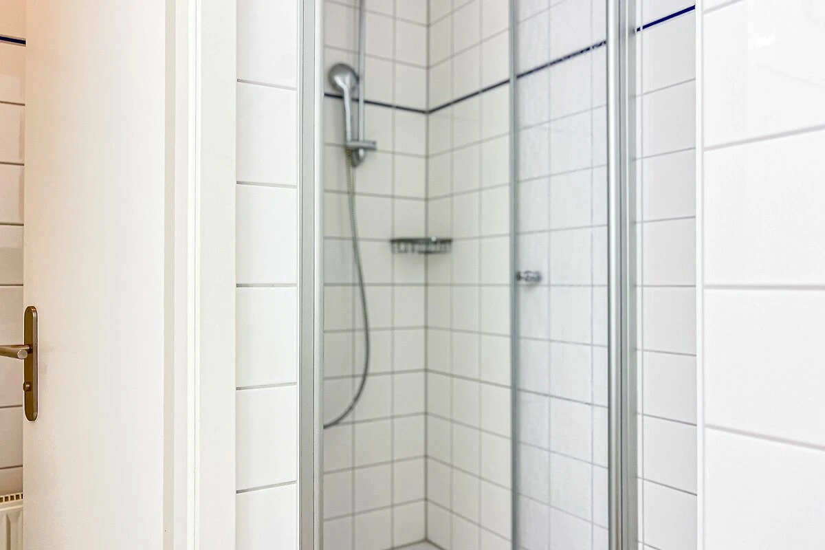 Auf der unteren Ebene befindet sich ein Schlafzimmer mit zwei Einzelbetten (90 x 200 cm) und einem Kleiderschrank. Über eine innenliegende Treppe erreichst du die beiden oberen Schlafräume mit jeweils einem Doppelbett (2 x 80 x 200 cm und 2 x 90 x 200 cm) und einem Kleiderschrank. Die Zimmer ermöglichen Rückzug und Ruhephasen auch tagsüber. In allen Schlafzimmern liegt Teppichboden. Die Fenster können mit Rollos verdunkelt werden.