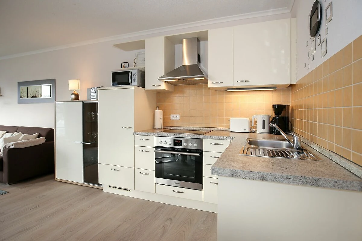 Die moderne Küchenzeile ist voll ausgestattet. Ein Kühlschrank mit Gefrierfach, ein Geschirrspüler, ein Backofen mit einem 4-Platten-Cerankochfeld, eine Mikrowelle, ein Toaster sowie eine Kaffeemaschine und ein Wasserkocher gehören zur Kücheneinrichtung.