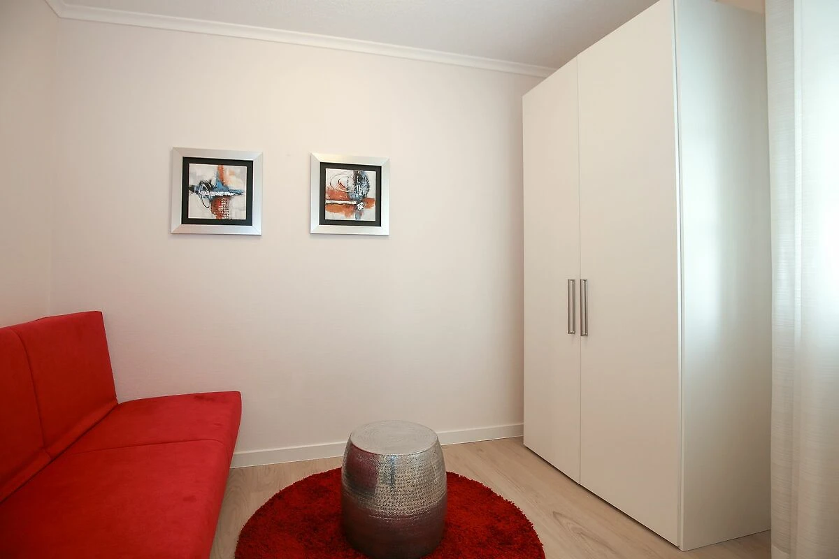 Im ersten Schlafzimmer der Ferienwohnung verspricht dir ein komfortables Doppelbett (2 x 90 x 200 cm) eine erholsame Nachtruhe. Ein großer Kleiderschrank bietet dir viel Stauraum für dein Urlaubsgepäck. Ein Flachbild-TV sorgt auch hier für abendliche Unterhaltung. Das zweite Schlafzimmer ist mit einer Schlafcouch (148 x 195 cm) ausgestattet. Auch hier bietet dir ein Kleiderschrank Stauraum. Die Schlafcouch (160 x 200 cm) im Wohnbereich wird schnell zu einem bequemen Schlafplatz für 2 Personen. In beiden Schlafzimmern sowie im Wohnbereich sind Vorhänge und Rollos als Sichtschutz oder zum Verdunkeln angebracht.