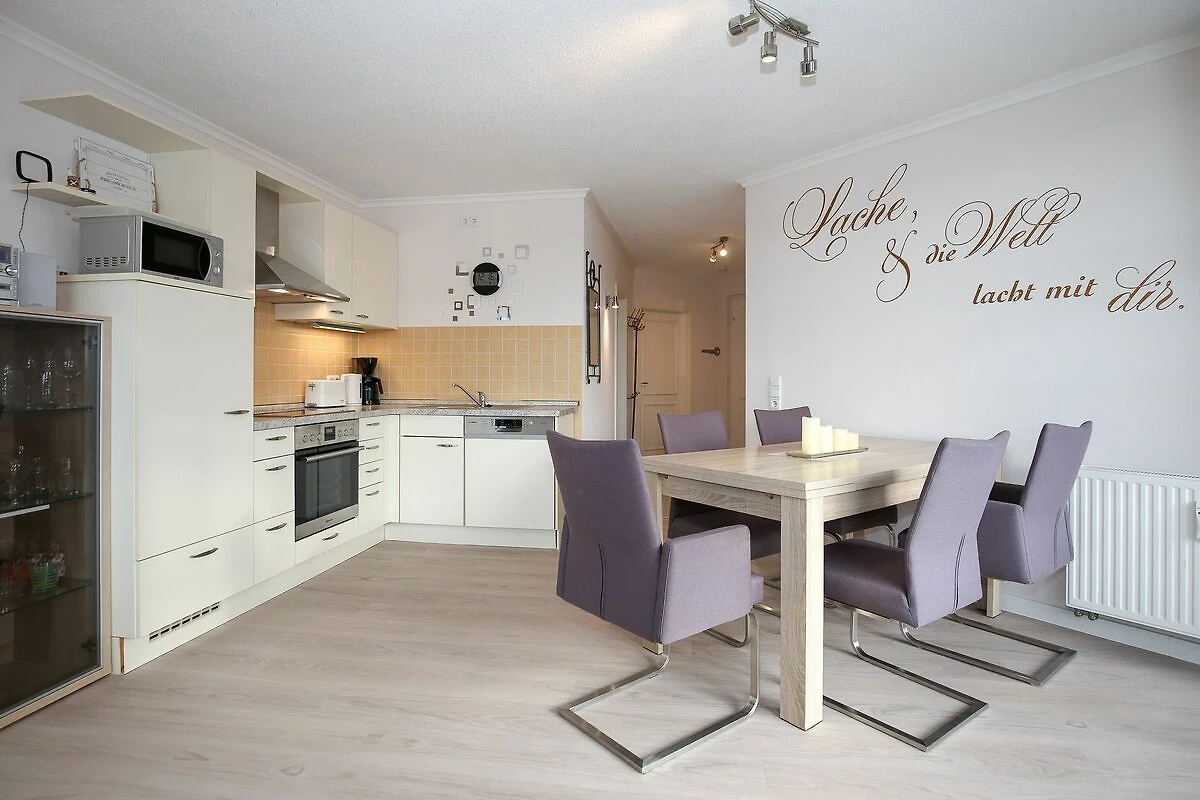 Im Wohnbereich der Ferienwohnung laden ein bequemes Sofa, ein Sessel sowie ein Flachbild-TV, ein Blue-Ray-Player und eine Stereoanlage zu geselligen Abenden ein. Der WLAN-Zugang steht dir kostenlos zur Verfügung. Der Esstisch verbindet den Wohnbereich mit der Küche. Der große Tisch mit 6 gepolsterten Stühlen bietet dir viel Platz für gemeinsame Mahlzeiten.