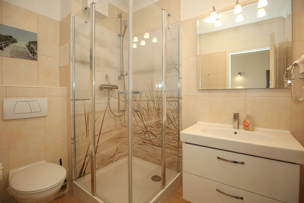 Das helle und moderne Duschbad mit WC verfügt über einen beleuchteten Spiegel und einen Waschtisch. Dieser bietet dir Ablagemöglichkeiten für deine Waschutensilien. Das Bad ist gefliest. Im Wohnraum sowie in den Schlafzimmern sind ein Vinyl-Boden verlegt. Ein Teppich vor der Couch sowie Läufer im ersten Schlafzimmer sorgen für Behaglichkeit. Es handelt sich um eine Nichtraucherwohnung. Haustiere sind hier nicht erlaubt.