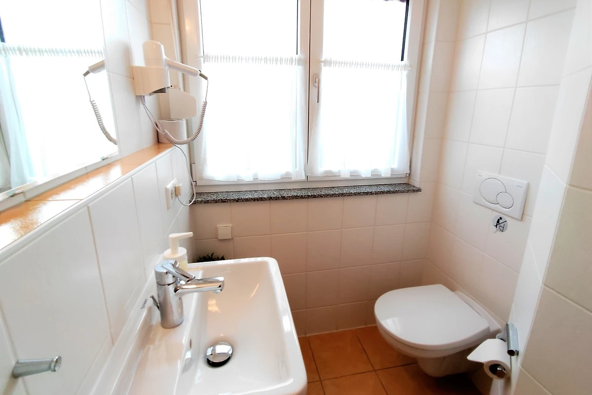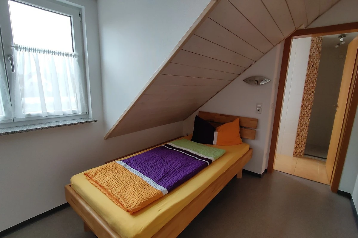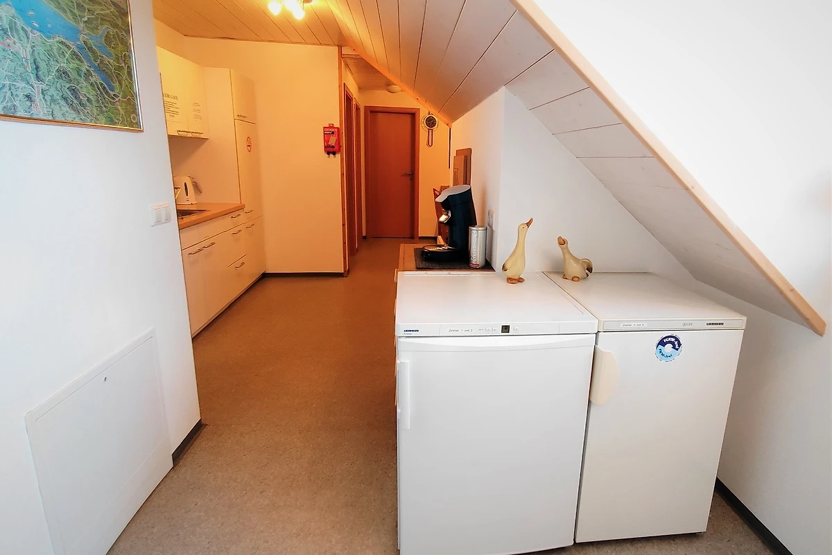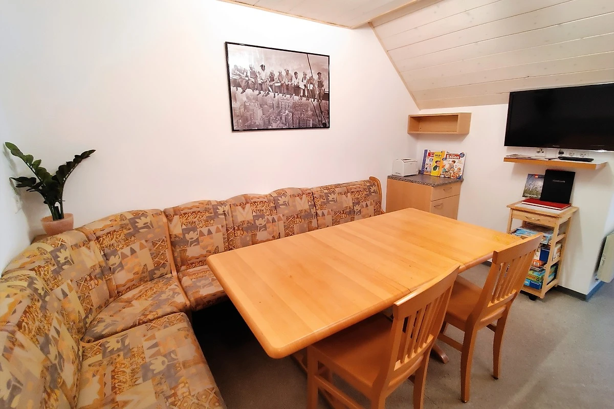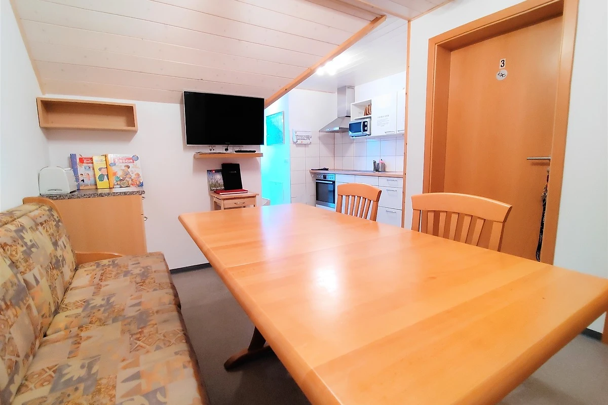Wir bieten Ihnen ein Einzelzimmer, ein Doppelzimmer und zwei Dreibettzimmer mit Gemeinschaftsküche. Alle Zimmer sind ausgestattet mit DU/WC und TV. Für Ihren Familienurlaub bestens geeignet, wenn jeder sein eigenes Zimmer als Rückzugsort bevorzugt.