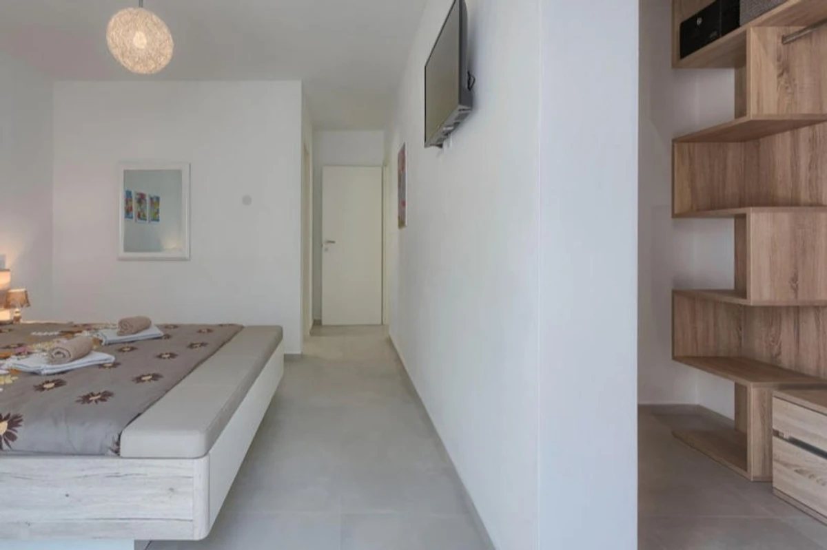 Das Obergeschoss besteht aus 2 Schlafzimmern mit Einbauschränken, mit 1 Franken. Bett mit Dusche/WC und TV, mit Klimaanlage und Ausgang zur Terrasse, 1 Schlafzimmer mit 1 Franken. Bett, Dusche/WC und TV und Klimaanlage.