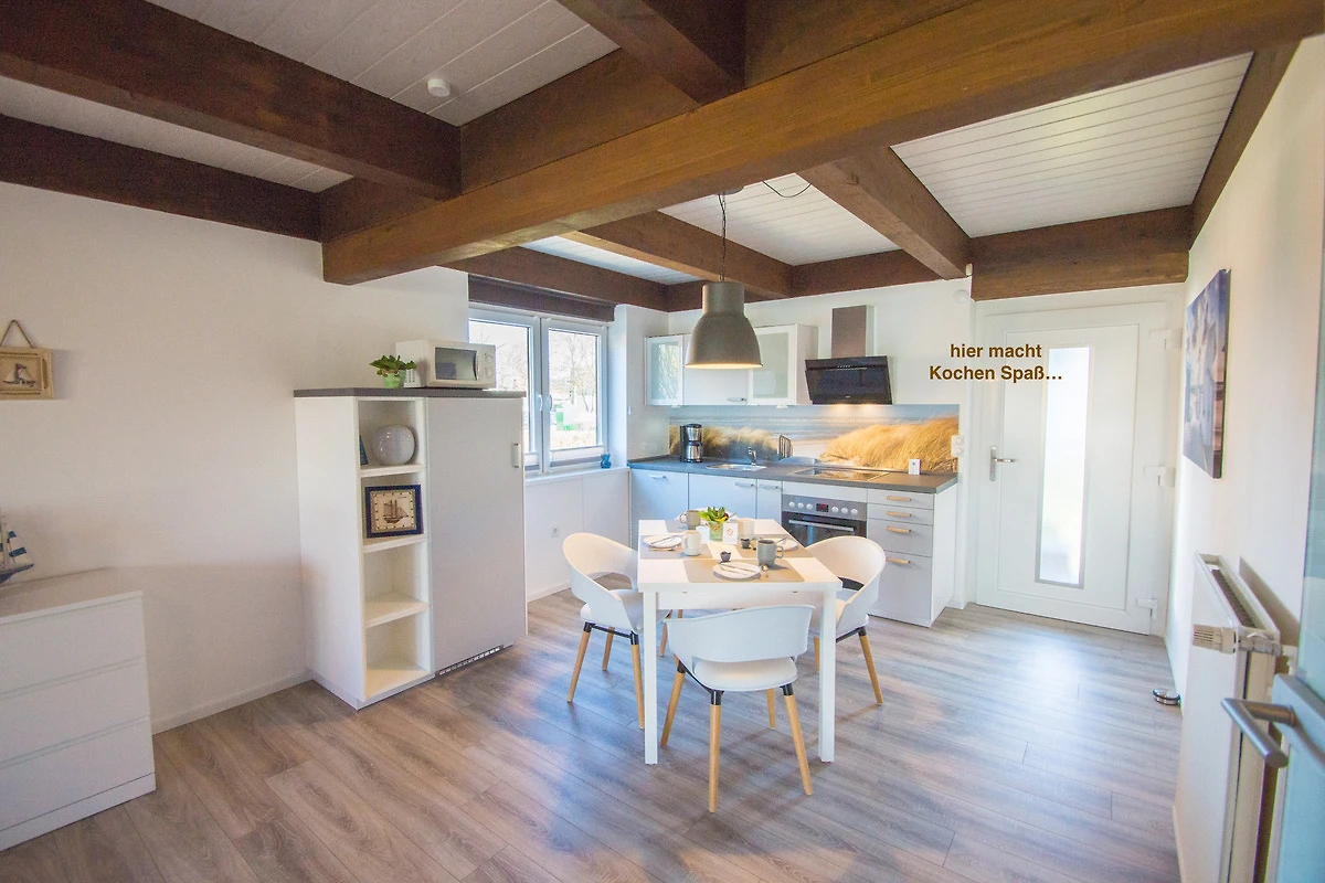 Wohlfühl-Urlaub in entspannter Atmosphäre, Aktivität und Ruhe - das ist in dieser tollen Doppelhaushälfte "Frische Brise" (Nichtraucher) möglich. Im EG befinden sich die zum Wohnbereich offene Küche mit grosszügigem Essplatz und die gemütliche Sitzgruppe mit Kaminofen. Von hier aus haben Sie einen freien Blick auf die geräumige Holzterrasse und den gepflegten, eingezäunten Garten. Smart-TV 47" mit DVD im Wohnzimmer; die Schlafcouch lässt sich kinderleicht in ein Doppelbett verwandeln. Stereoanlage mit Radio/CD, WLAN und Wertsachentresor sind vorhanden. Die Küche ist ausgestattet mit Kühlschrank/Gefrierfach, Geschirrspüler, E-Herd mit Ceranfeld und Mikrowelle. Im 1. OG ist das geräumige Schlafzimmer mit Doppelbett (verstellbare Lattenroste, Fliegennetz und Verdunkelung), Lesesessel und einem bequemen Schlafsofa (2 x 70x200). Hier befindet sich auch ein 2. Fernseher (SAT-TV 32") sowie ein Reisebettchen (gut verpackt in der dazugehörigen Tasche) und der direkte Zugang zum Wohlfühl-Bad. Ein Hochstuhl (befindet sich bei Anreise in der Garage) sowie einige Bücher und Gesellschaftsspiele runden die Ausstattung ab. Im Untergeschoss gibt es ein Gäste-WC. Gartenmöbel und ein Holzkohlegrill stehen zur freien Verfügung.