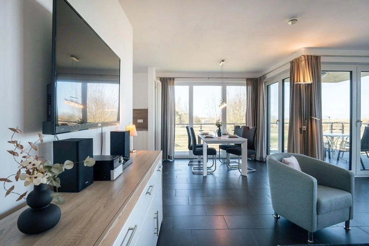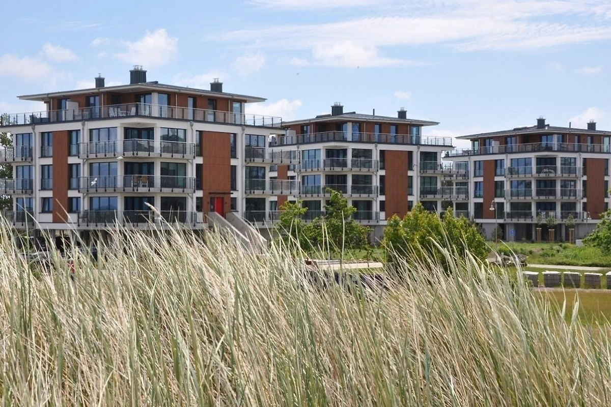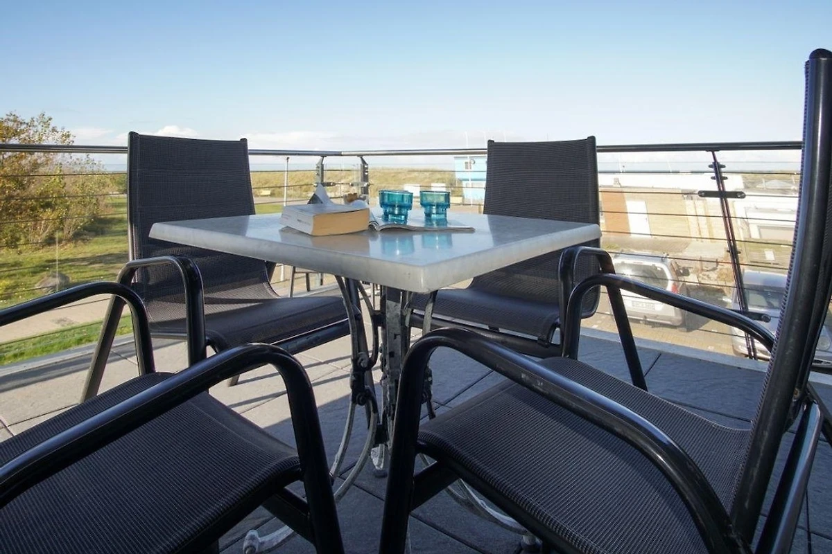 Vom Wohnzimmer aus gelangen Sie auf den Balkon mit Blick zur Ostsee.
