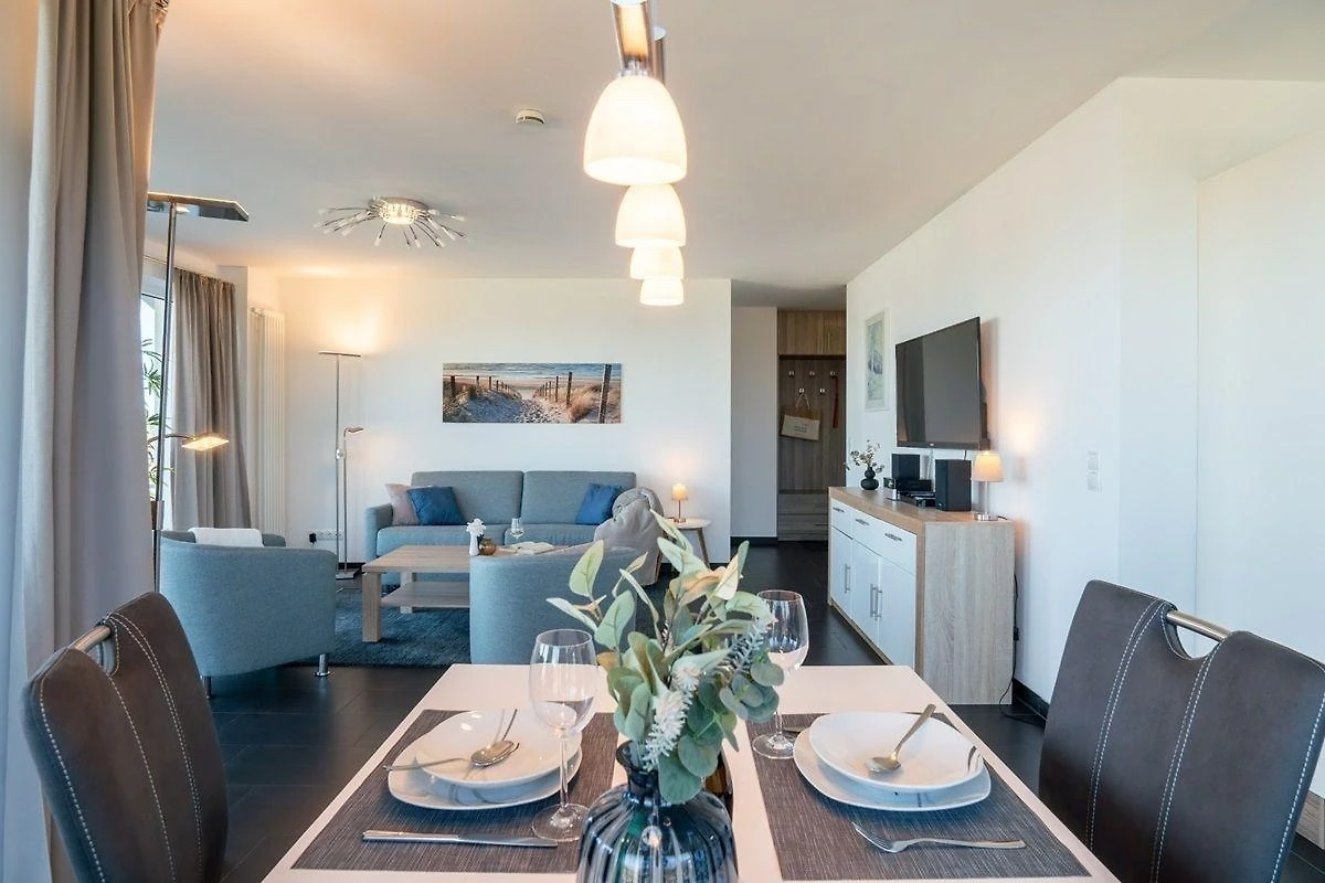 Urlauben Sie auf grosszügigen 65 m² (Erdgeschoss/Hochparterre) mit Nordwest-Balkon. Das lichtdurchflutete Wohnzimmer ist mit einer gemütlichen Sofaecke (Schlafsofa 160*190cm), TV und DVD-Player ausgestattet. Im Essbereich finden bequem vier Personen Platz zum Schlemmen. Die angrenzende Küchenzeile ist, für den Urlaubsbedarf, voll ausgestattet. Ein Backofen und ein Geschirrspüler gehören ebenso dazu, wie die Kaffeemaschine, der Wasserkocher und ein Toaster. Geschirr und Besteck sind ausreichend vorhanden.