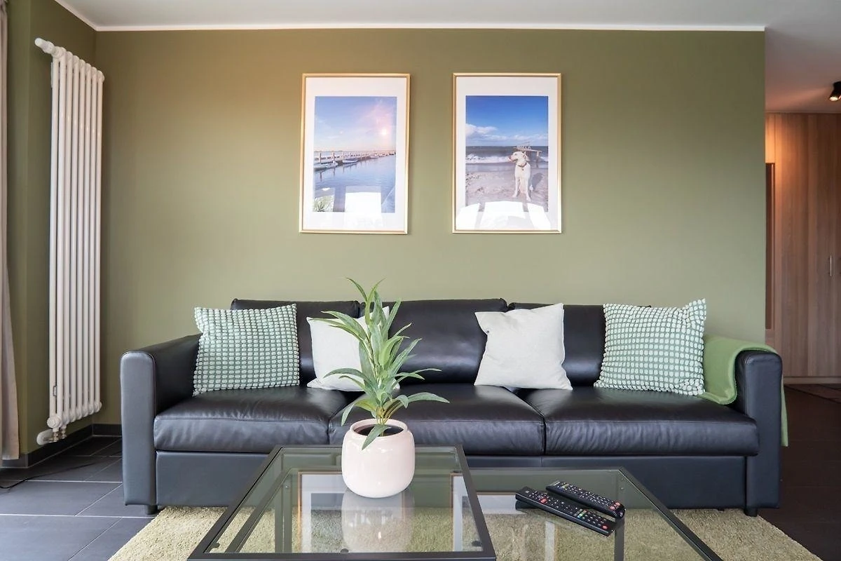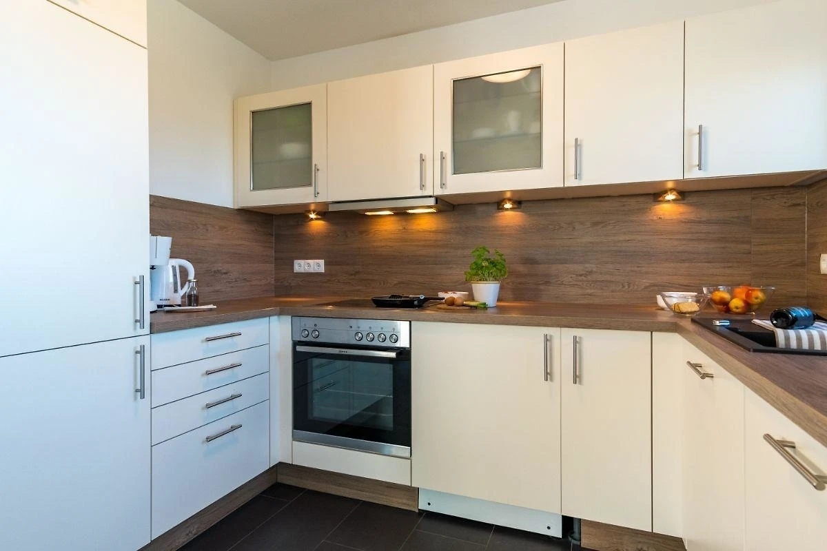 Urlauben Sie auf grosszügigen 65 m² (Erdgeschoss/Hochparterre) mit Südost-Balkon. Das lichtdurchflutete Wohnzimmer ist mit einer gemütlichen Sofaecke (Schlafsofa 160*190cm), TV und DVD-Player ausgestattet. Im Essbereich finden bequem vier Personen Platz zum Schlemmen. Die angrenzende Küchenzeile ist, für den Urlaubsbedarf, voll ausgestattet. Ein Backofen und ein Geschirrspüler gehören ebenso dazu, wie die Kaffeemaschine, der Wasserkocher und ein Toaster. Geschirr und Besteck sind ausreichend vorhanden.