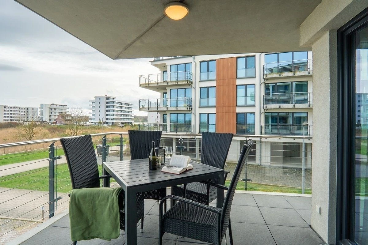 Vom Wohnzimmer aus gelangen Sie auf den Balkon mit Blick zur Ostsee.