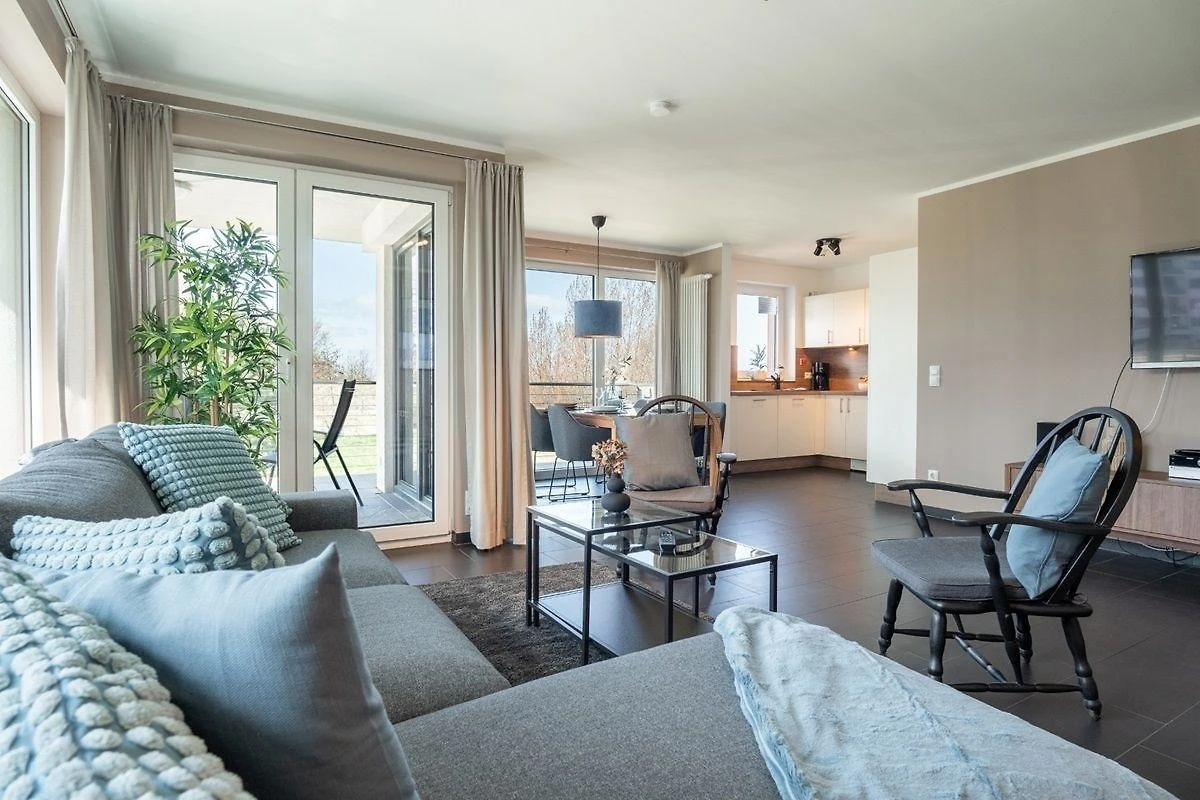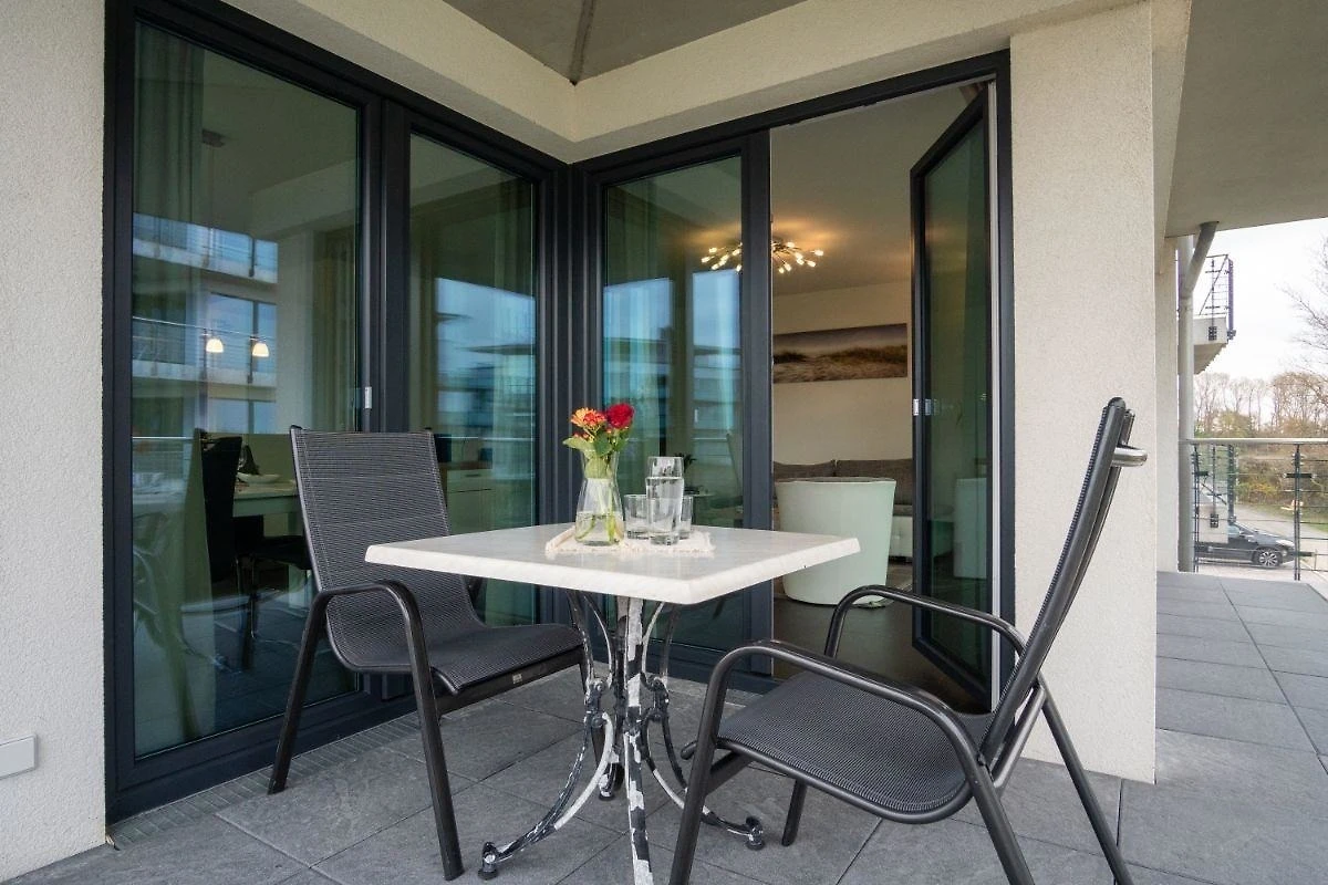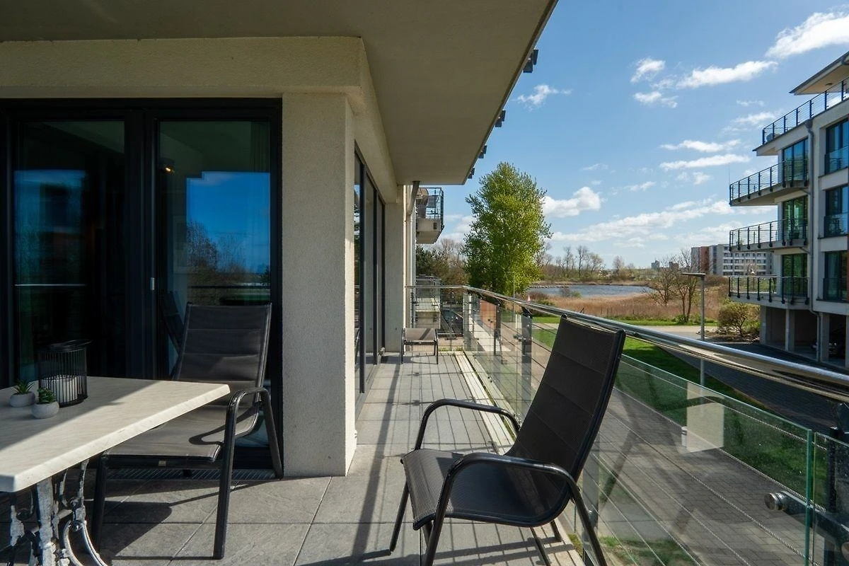 Vom Wohnzimmer aus gelangen Sie auf den Balkon mit Blick zur Ostsee.