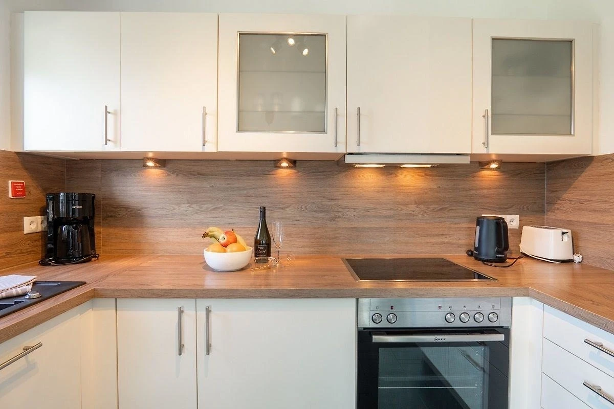 Urlauben Sie auf grosszügigen 65 m² (Erdgeschoss/Hochparterre) mit Südwest-Balkon. Das lichtdurchflutete Wohnzimmer ist mit einer gemütlichen Sofaecke (Schlafsofa 160*190cm), TV und DVD-Player ausgestattet. Im Essbereich finden bequem vier Personen Platz zum Schlemmen. Die angrenzende Küchenzeile ist, für den Urlaubsbedarf, voll ausgestattet. Ein Backofen und ein Geschirrspüler gehören ebenso dazu, wie die Kaffeemaschine, der Wasserkocher und ein Toaster. Geschirr und Besteck sind ausreichend vorhanden.