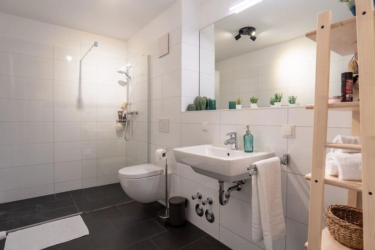 Das Badezimmer ist mit einer ebenerdigen Dusche mit Glastrennwand ausgestattet.