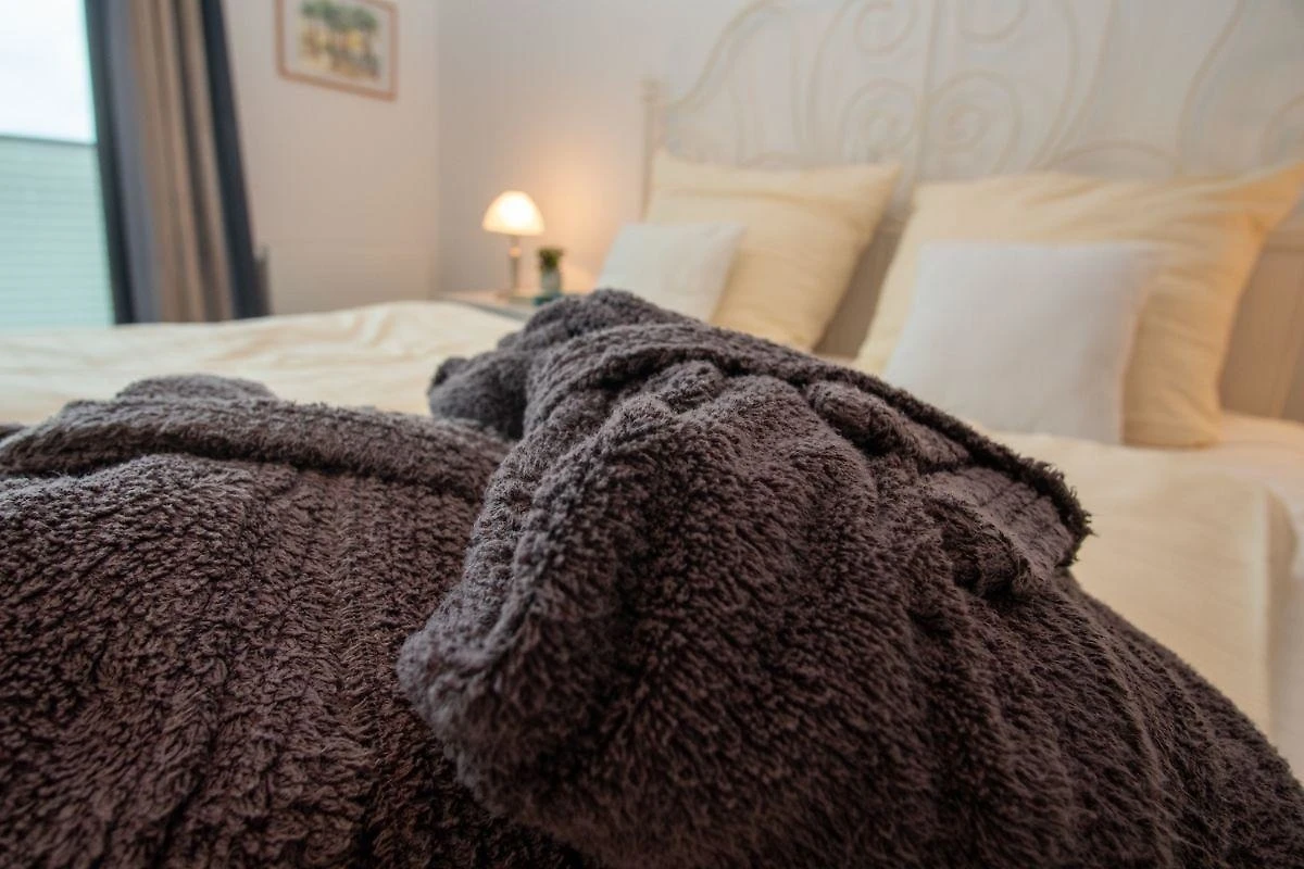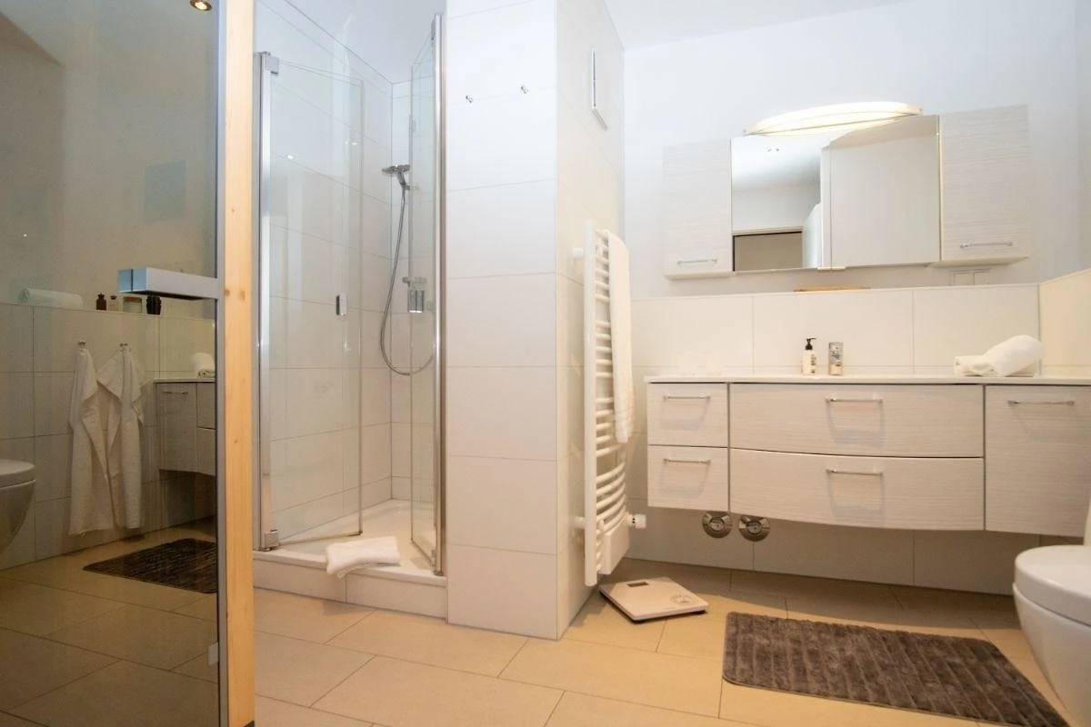 Das grosse Schlafzimmer verfügt über ein gemütliches Doppelbett (160*200cm). Das zweite Schlafzimmer ist mit zwei gemütlichen Einzelbetten, TV und einem geräumigen Schrank eingerichtet. Das Badezimmer ist mit einer ebenerdigen Dusche mit Glastrennwand und eine Infrarotsaune (für eine Person) ausgestattet.