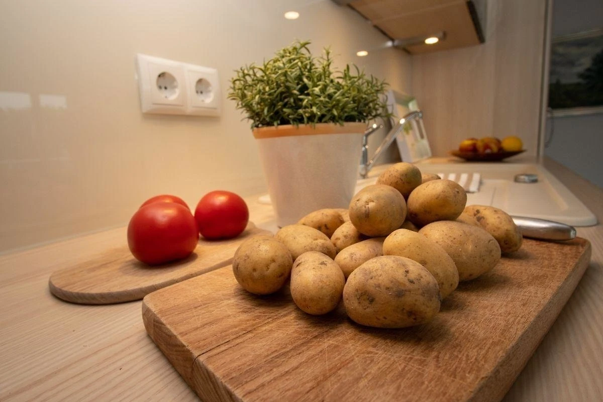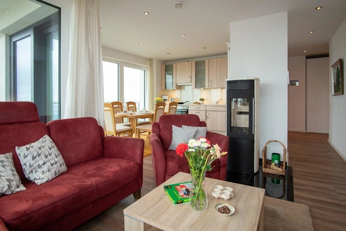 Urlauben Sie auf grosszügigen 70 m² (2. Etage) mit Nordwest-Balkon. Das lichtdurchflutete Wohnzimmer ist mit einer gemütlichen Sofaecke, Flatscreen-TV und Kaminofen ausgestattet. Im Essbereich finden bequem vier Personen Platz zum Schlemmen. Die angrenzende Küchenzeile ist, für den Urlaubsbedarf, voll ausgestattet. Ein Backofen und ein Geschirrspüler gehören ebenso dazu, wie die Kaffeemaschine, der Wasserkocher und ein Toaster. Geschirr und Besteck sind ausreichend vorhanden.