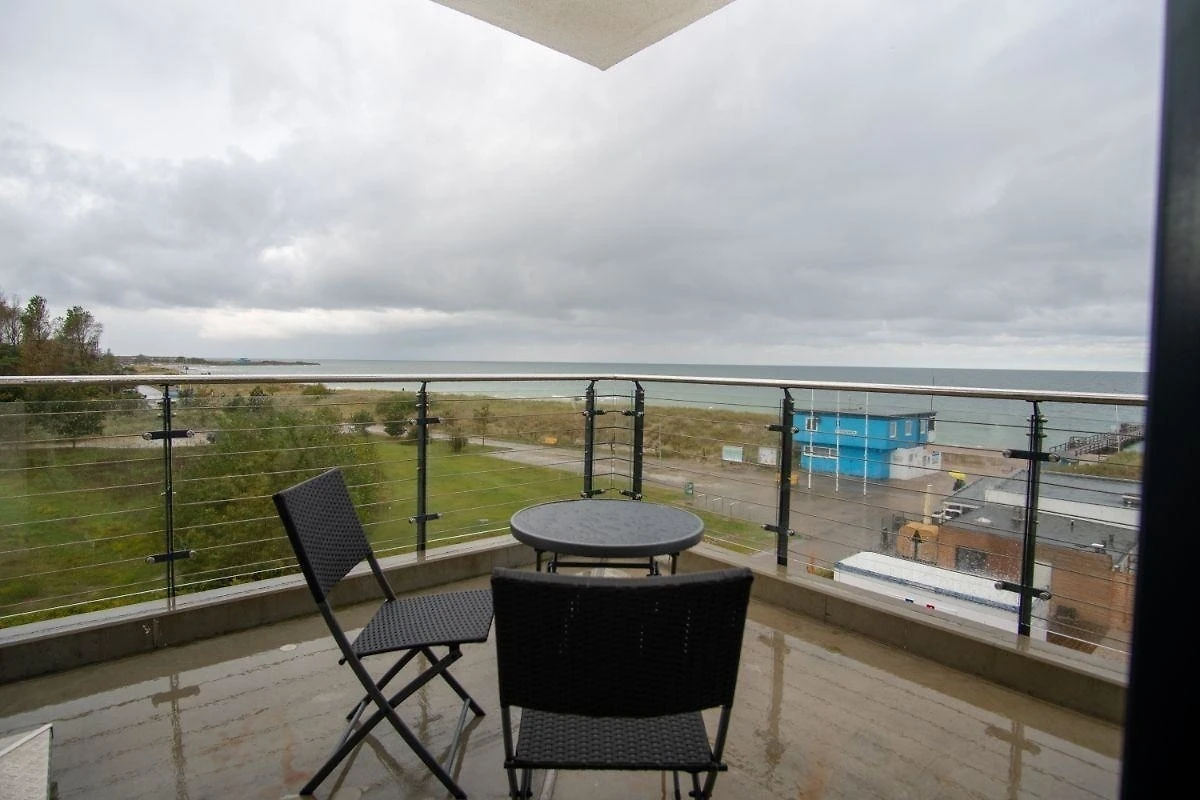 Vom Wohnzimmer aus gelangen Sie auf den Balkon mit Blick zur Ostsee.