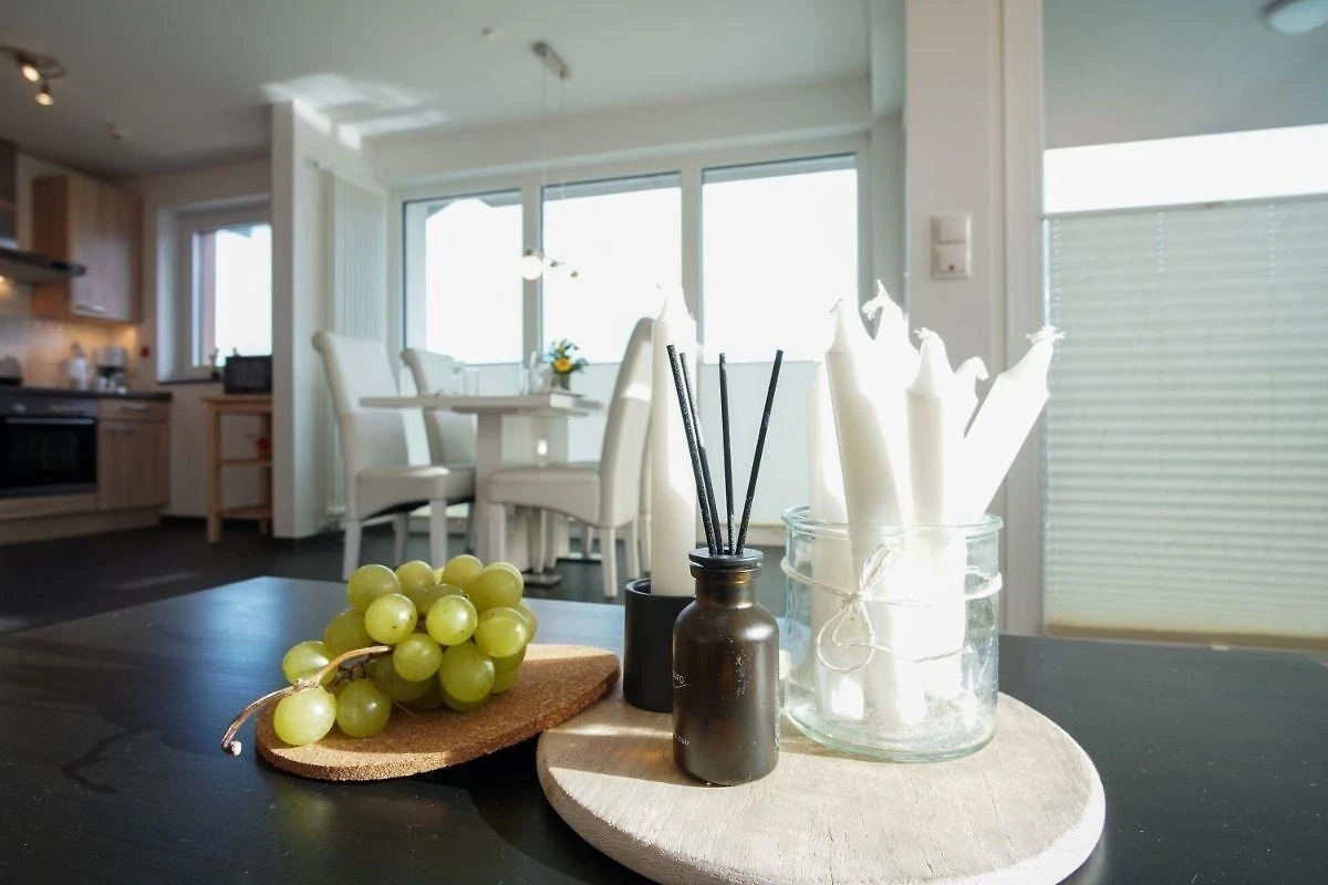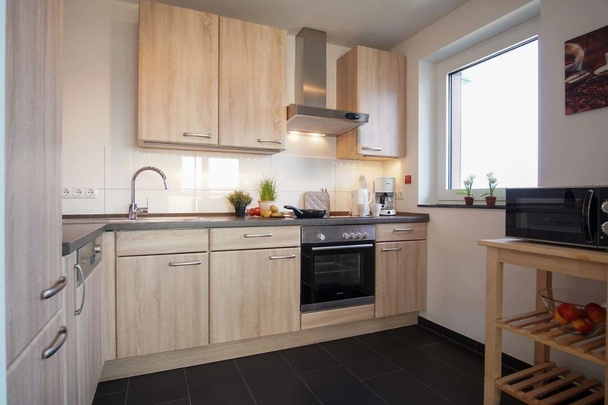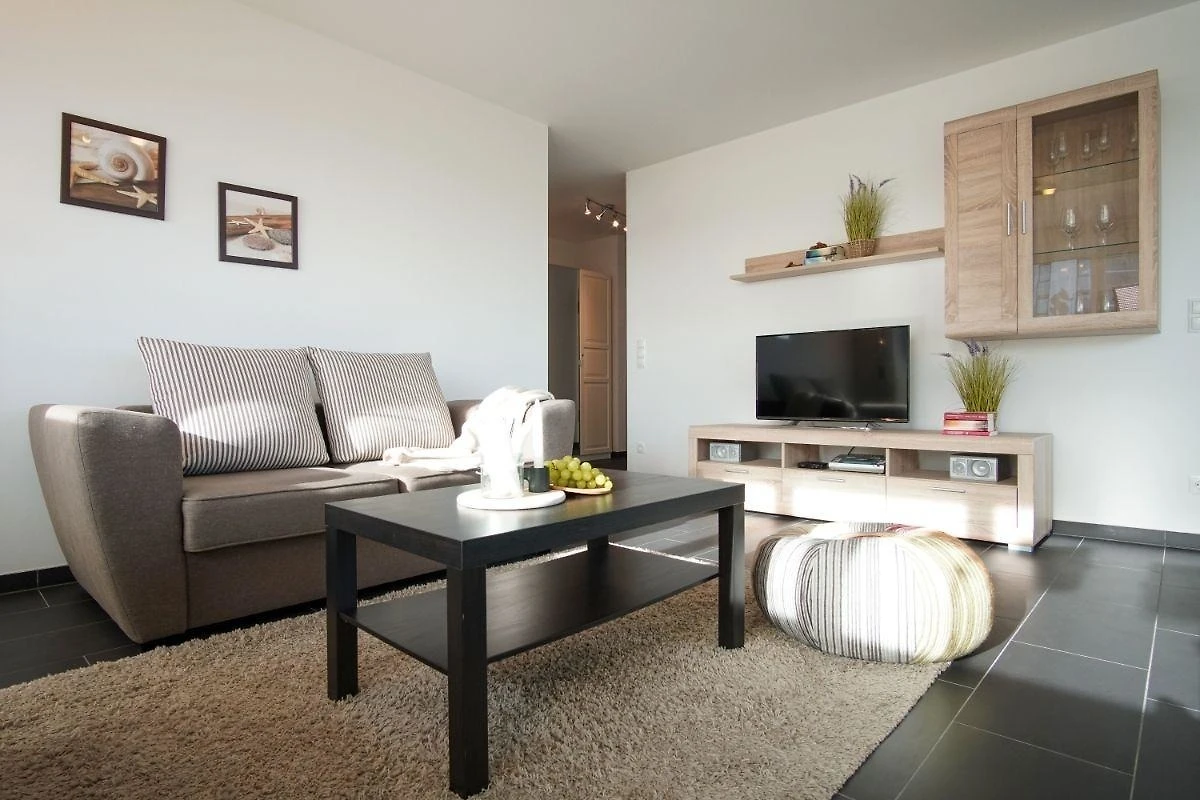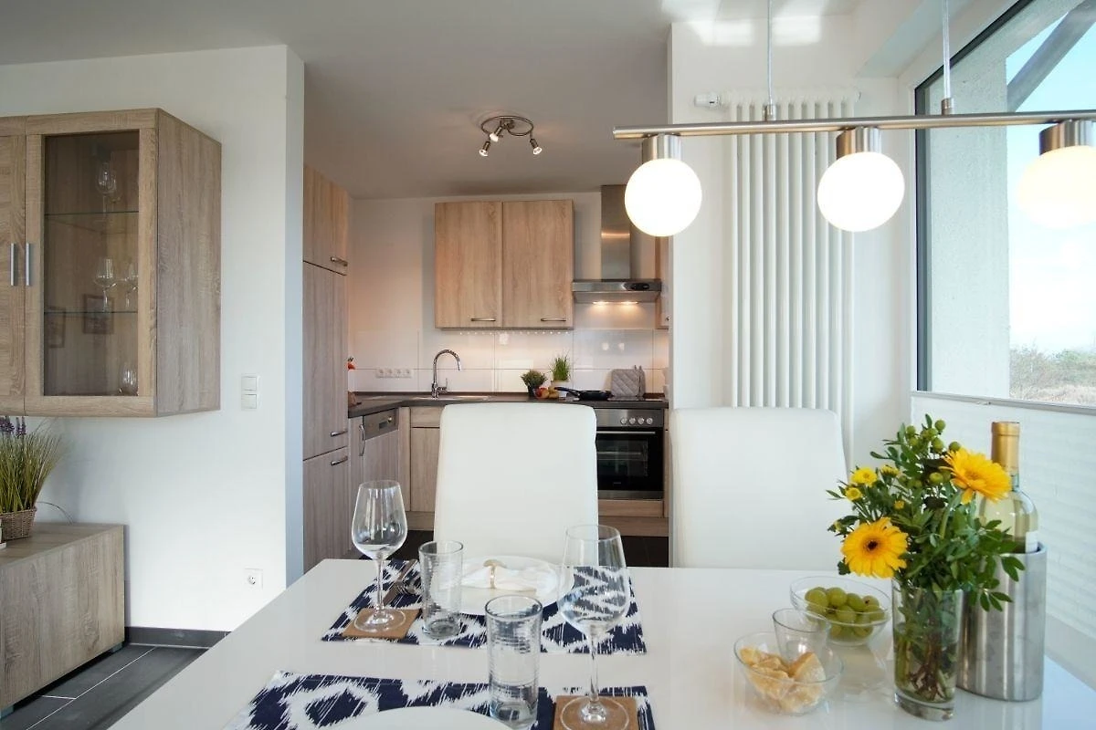 Urlauben Sie auf grosszügigen 65 m² (Erdgeschoss/Hochparterre) mit Südost-Balkon. Das lichtdurchflutete Wohnzimmer ist mit einer gemütlichen Sofaecke, TV und Büchern ausgestattet. Im Essbereich finden bequem bis zu vier Personen Platz zum Schlemmen. Die angrenzende Küchenzeile ist, für den Urlaubsbedarf, voll ausgestattet. Ein Backofen und ein Geschirrspüler gehören ebenso dazu, wie die Kaffeemaschine, der Wasserkocher und ein Toaster. Geschirr und Besteck sind ausreichend vorhanden.