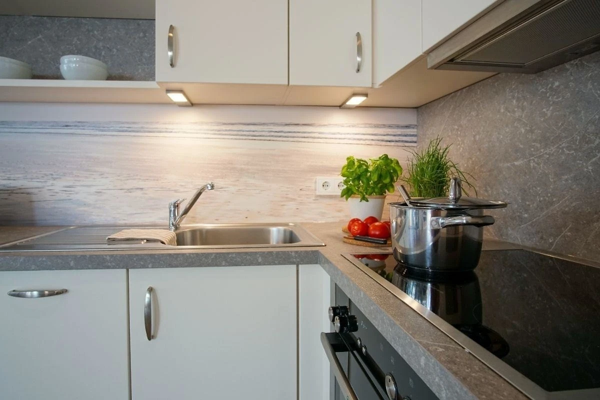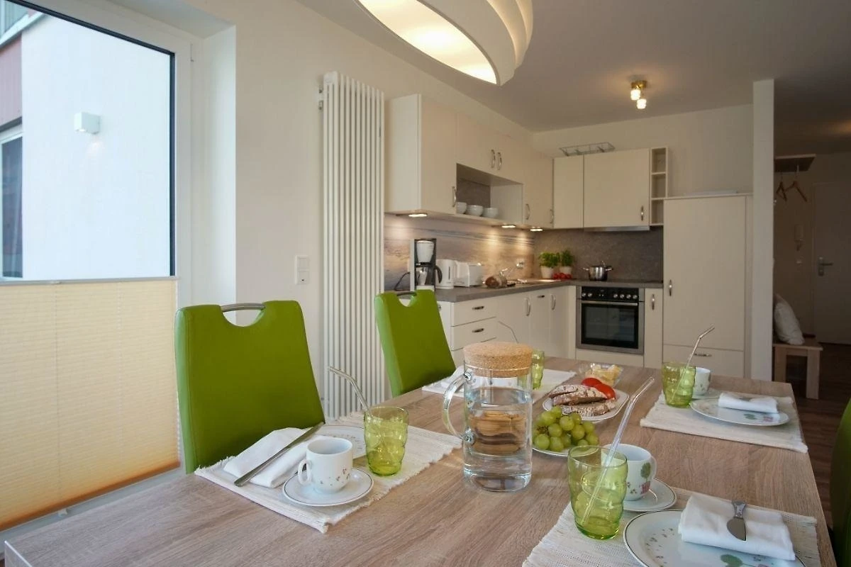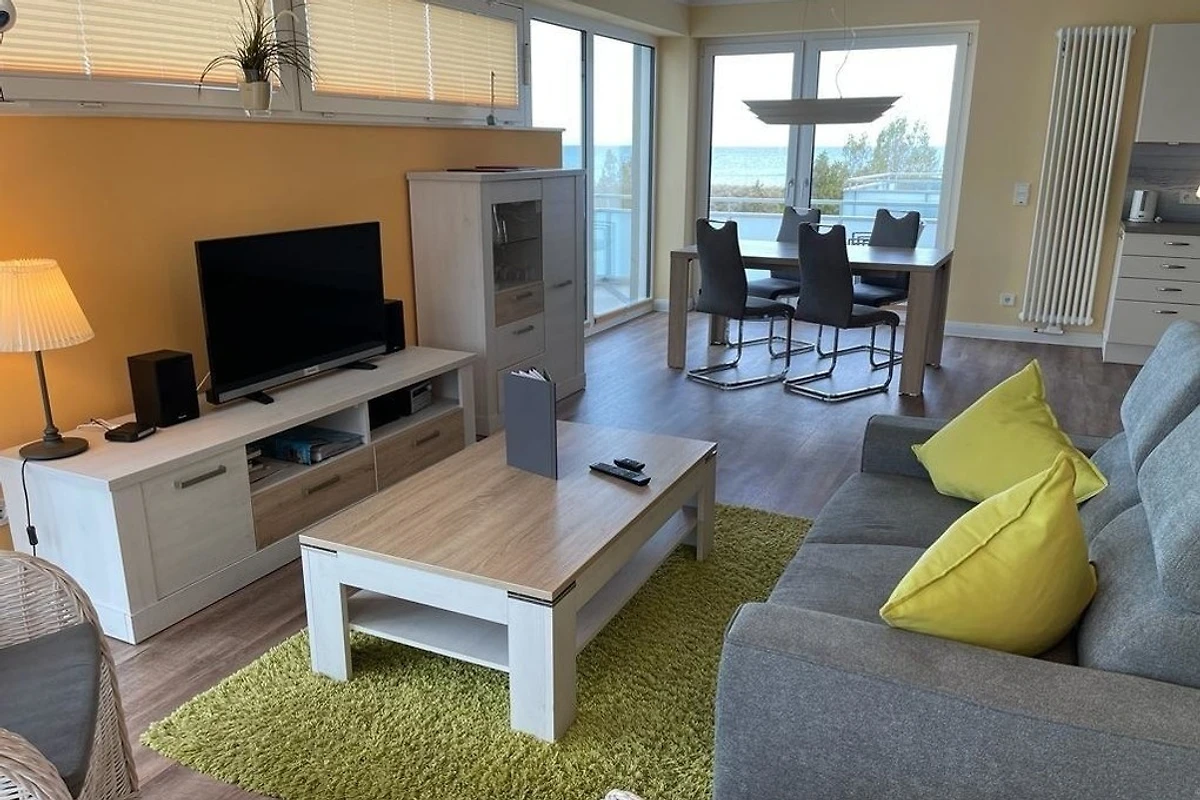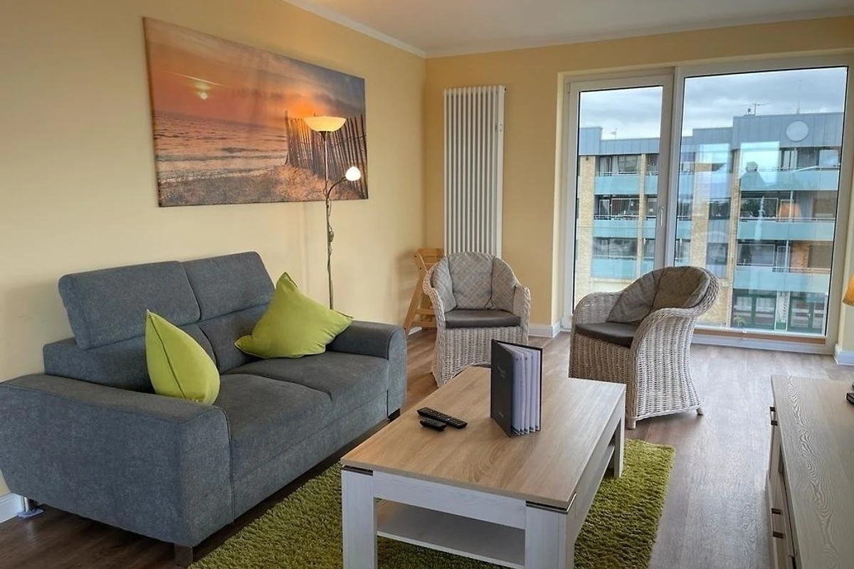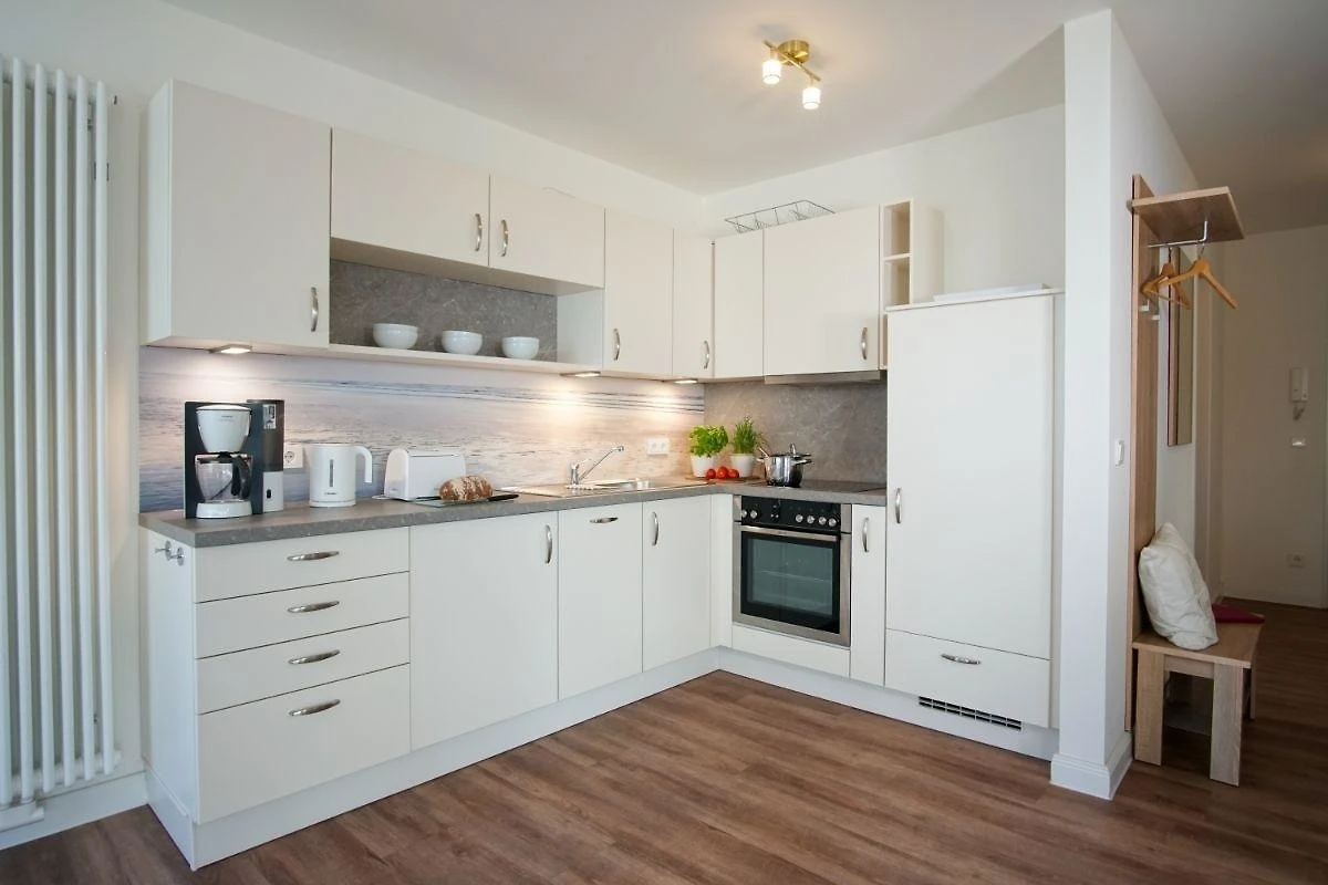 Urlauben Sie auf grosszügigen 76 m² (2. Etage) mit Nordwest-Balkon. Das lichtdurchflutete Wohnzimmer ist mit einer gemütlichen Sofaecke und Flatscreen-TV ausgestattet. Im Essbereich finden bequem vier Personen Platz zum Schlemmen. Die angrenzende Küchenzeile ist, für den Urlaubsbedarf, voll ausgestattet. Ein Backofen und ein Geschirrspüler gehören ebenso dazu, wie die Kaffeemaschine, der Wasserkocher und ein Toaster. Geschirr und Besteck sind ausreichend vorhanden.