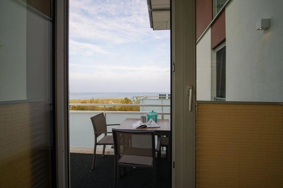 Vom Wohnzimmer aus gelangen Sie auf den Balkon mit Blick zur Ostsee.