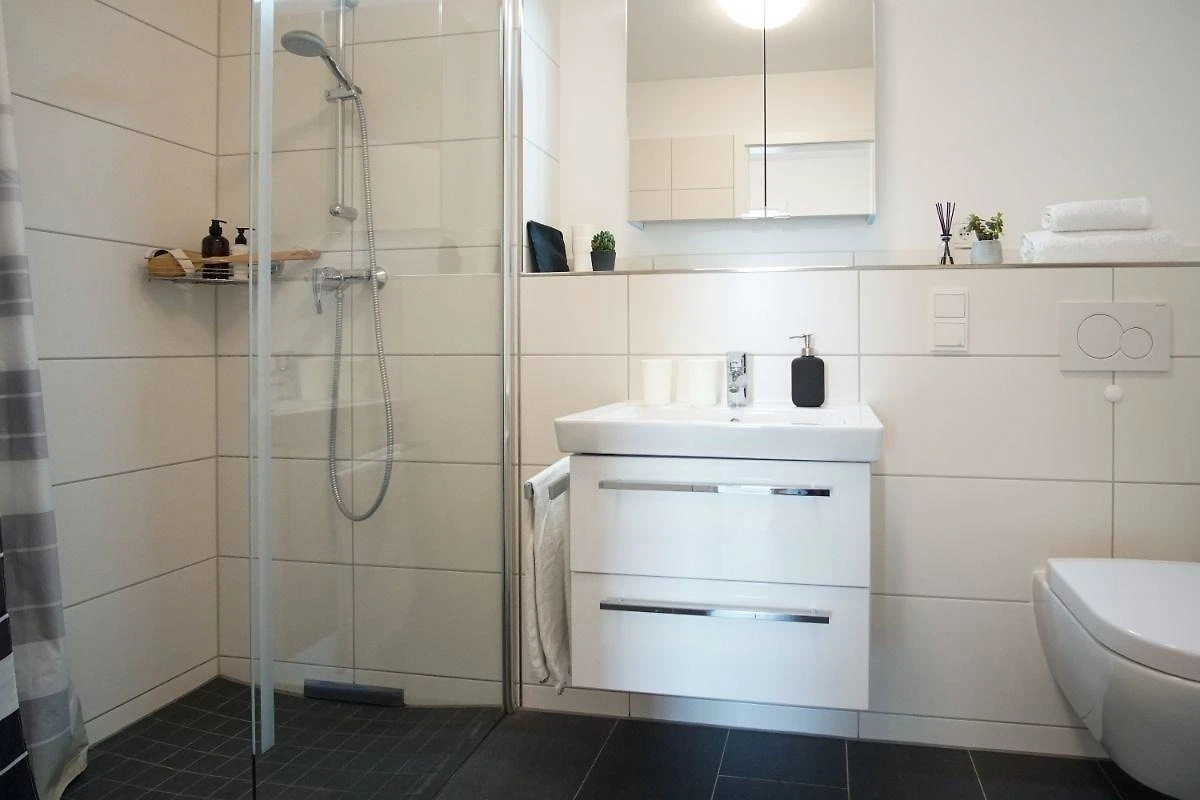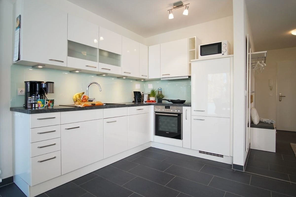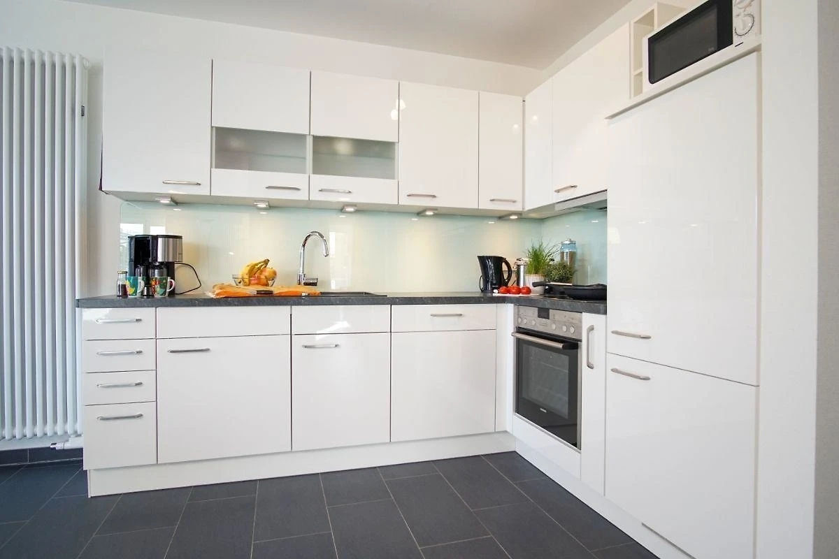 Urlauben Sie auf grosszügigen 76 m² (Erdgeschoss/Hochparterre) mit Nordwest-Balkon. Das lichtdurchflutete Wohnzimmer ist mit einer gemütlichen Sofaecke und Flatscreen-TV ausgestattet. Im Essbereich finden bequem vier Personen Platz zum Schlemmen. Die angrenzende Küchenzeile ist, für den Urlaubsbedarf, voll ausgestattet. Ein Backofen und ein Geschirrspüler gehören ebenso dazu, wie die Kaffeemaschine, der Wasserkocher und ein Toaster. Geschirr und Besteck sind ausreichend vorhanden.