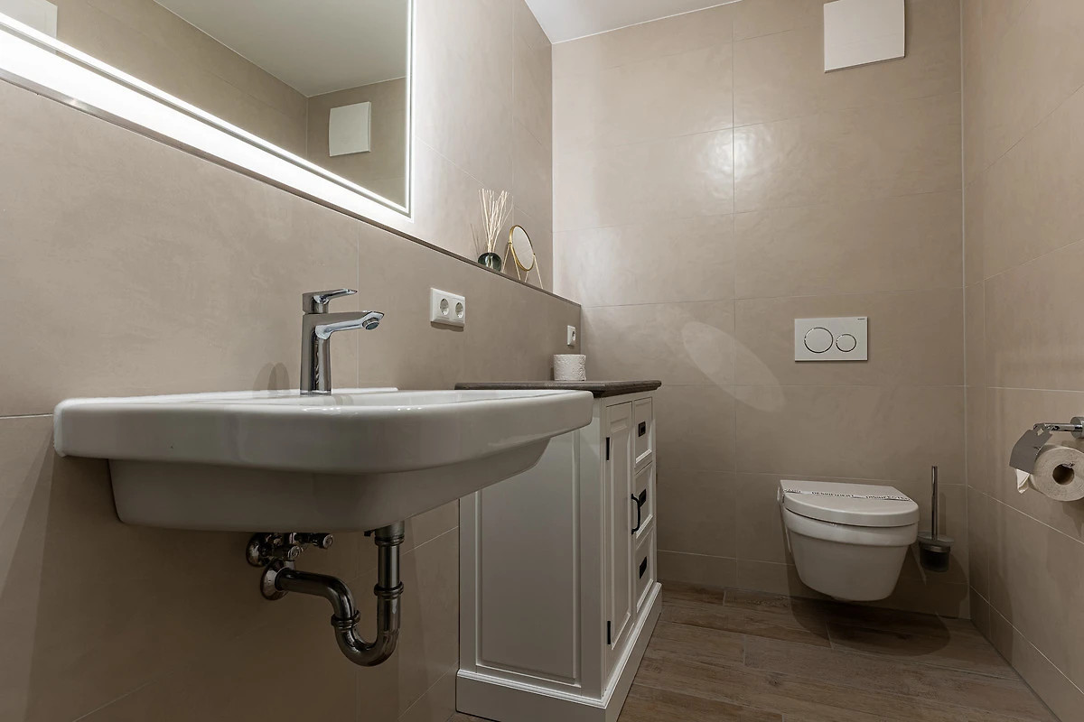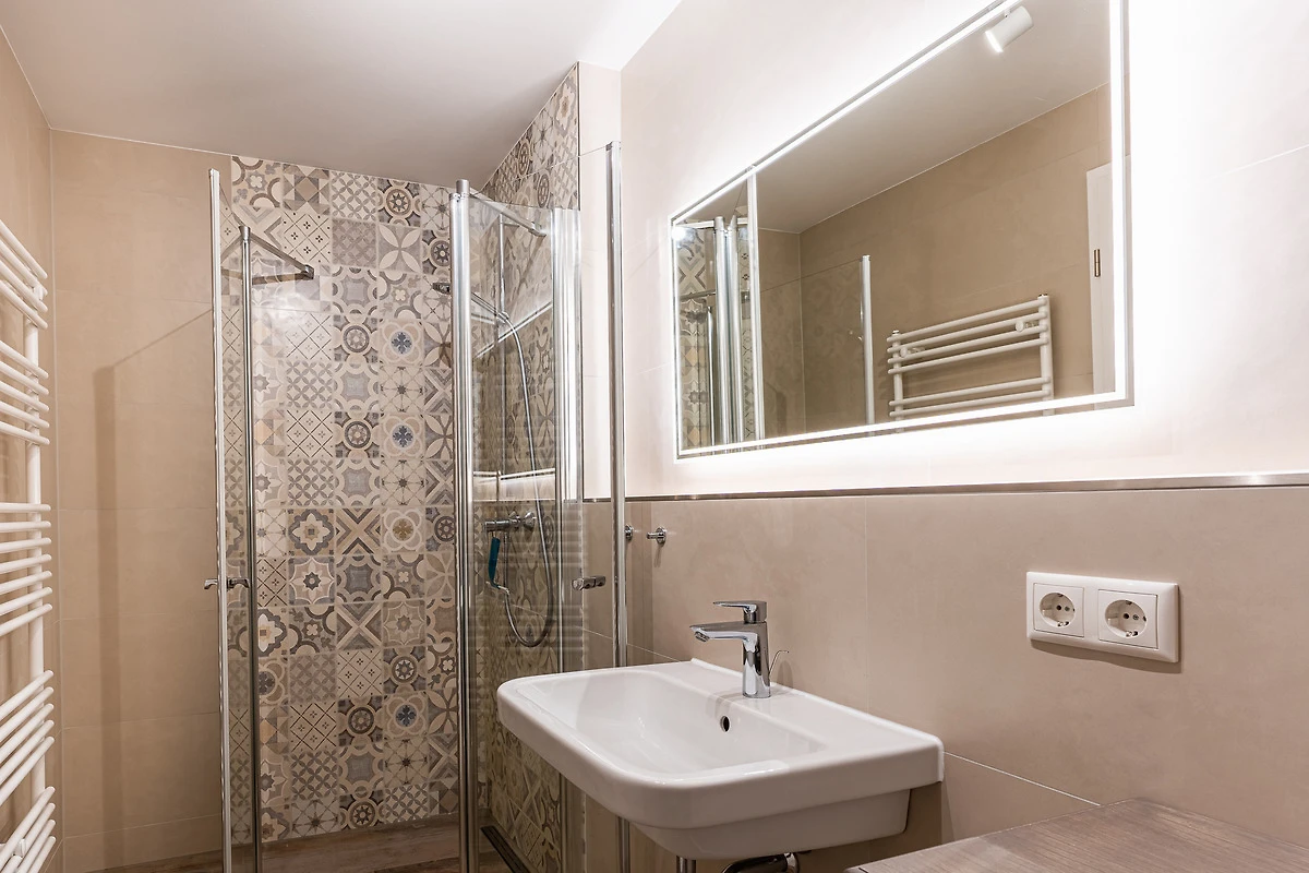Das stimmungsvolle Badezimmer verfügt über eine ebenerdige Dusche, WC sowie einem modernem Waschtisch mit grossem, beleuchtetem Spiegel. Ein Reisefön ist vorhanden.