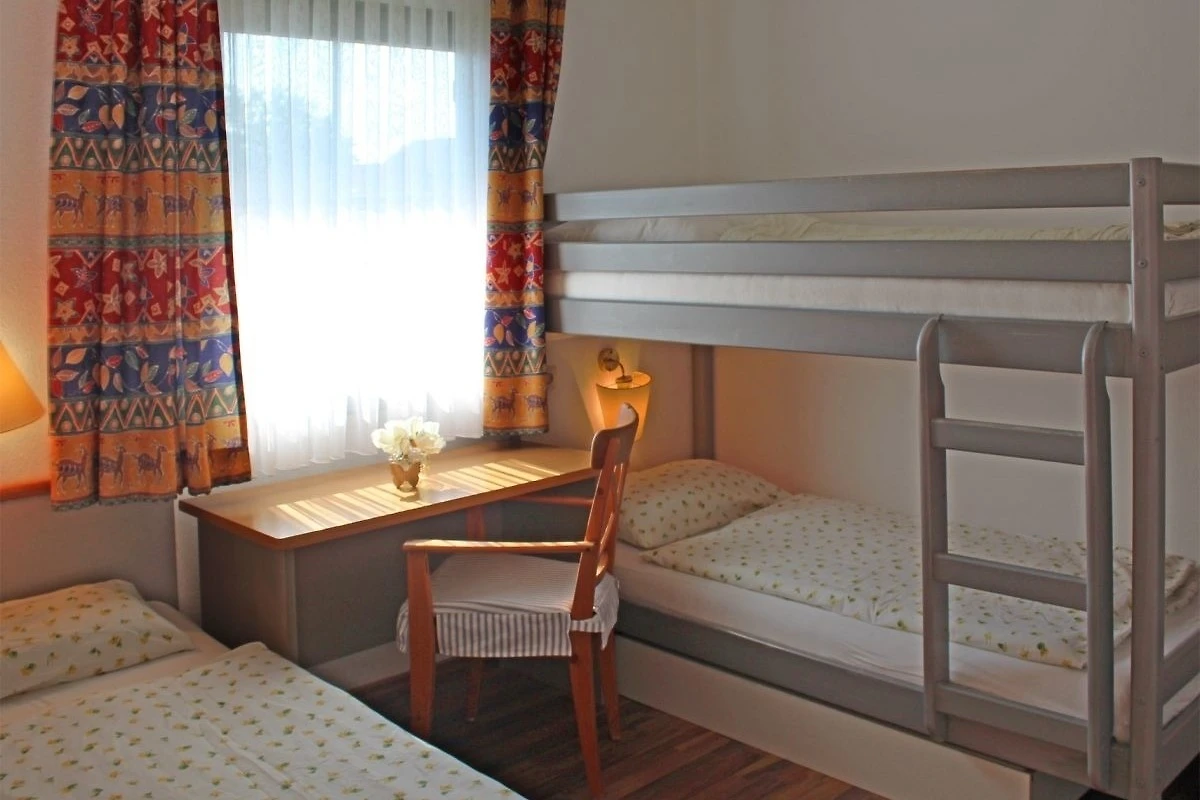 mit einem Einzelbett, einem Stockbett, Schreibtisch und Kleiderschrank