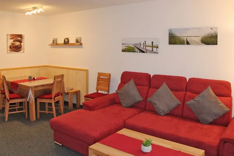 Das hell und freundlich eingerichtete Wohnzimmer lädt ein, sich wohl zu fühlen. Die schöne Sitzgruppe bietet Platz für alle Gäste und verfügt über eine schöne, moderne Couch. Flachbild-Fernseher und Radio gehören ebenfalls zur Ausstattung dieses Hauses. Vom Wohnzimmer aus gelangen Sie direkt auf Ihre Terrasse. Grillen mit Ihrem eigenen Grill ist gestattet. Der direkt angrenzende Essbereich bietet Platz für Ihre gemeinsamen Mahlzeiten und gemütliche Abende.