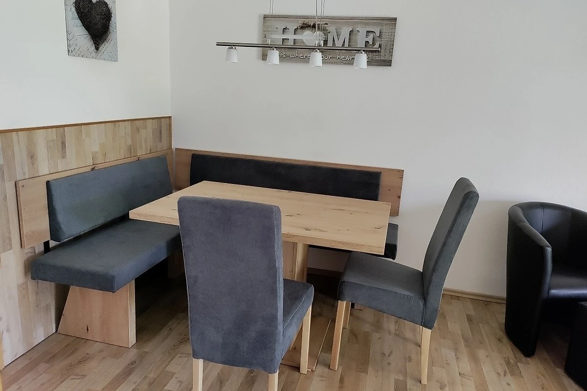 • Wohnzimmer mit Sofa und zwei Sesseln, ein gemütlicher Essplatz mit Eckbank