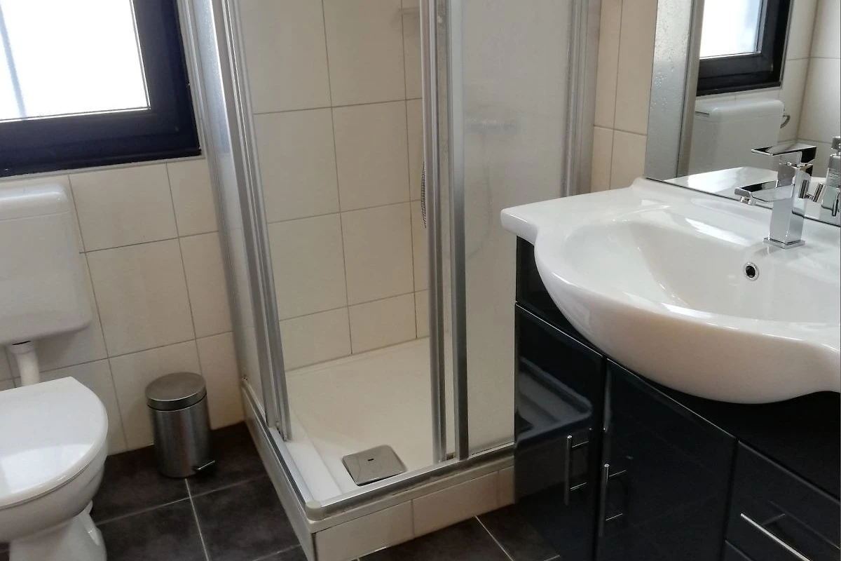 mit Toilette, Dusche, Waschbecken inkl. Unterschrank, Spiegel, sowie Kosmetikspiegel.