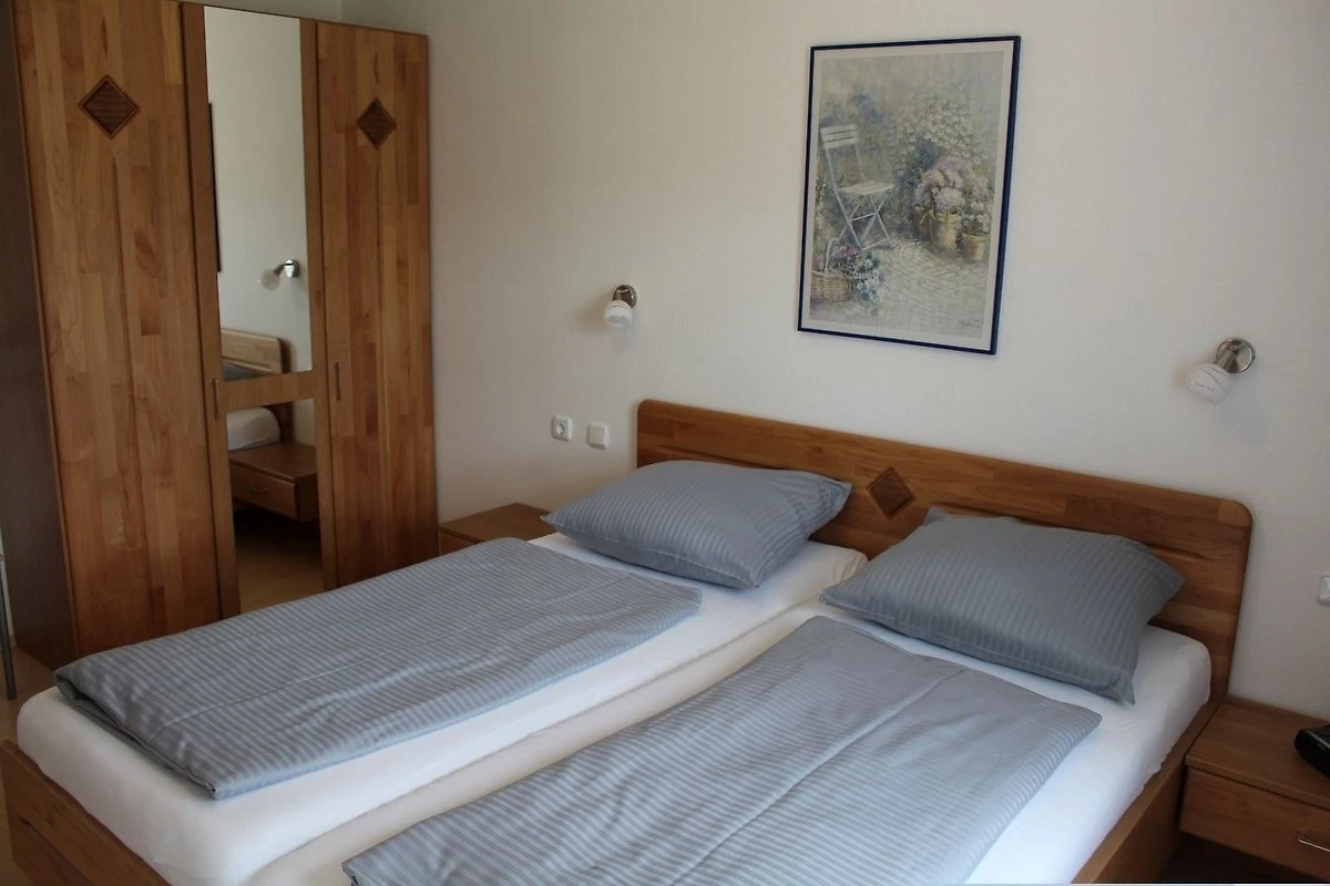 mit Doppelbett und Kleiderschrank. Auch von diesem Zimmer aus haben Sie Zutritt zur Terrasse.
