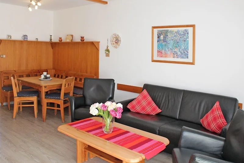 1 gemütliches Wohn-Esszimmer mit Essgruppe, Polstersitzgruppe mit Schlafcouch, TV, Telefon, Radio mit CD.