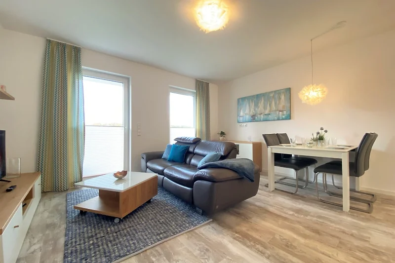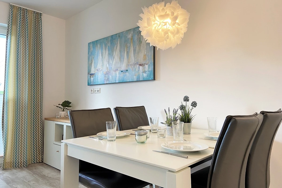 Das kombinierte Wohn/Esszimmer mit offener Küche besticht durch seine geschmackvolle Einrichtung. Der Wohnbereich ist mit einer gemütlichen Couch, sowie einem grossen Flatscreen-TV und Musikanlage mit Bluetoothausgestattet. An dem grossen Esstisch findet sich genügend Platz für bis zu 4 Personen.