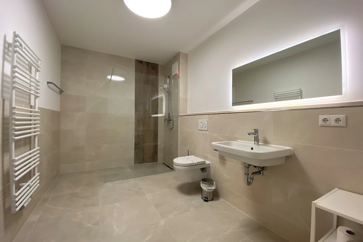 Das moderne Badezimmer ist mit Waschtisch, WC, ebenerdiger Dusche und Haarfön ausgestattet.