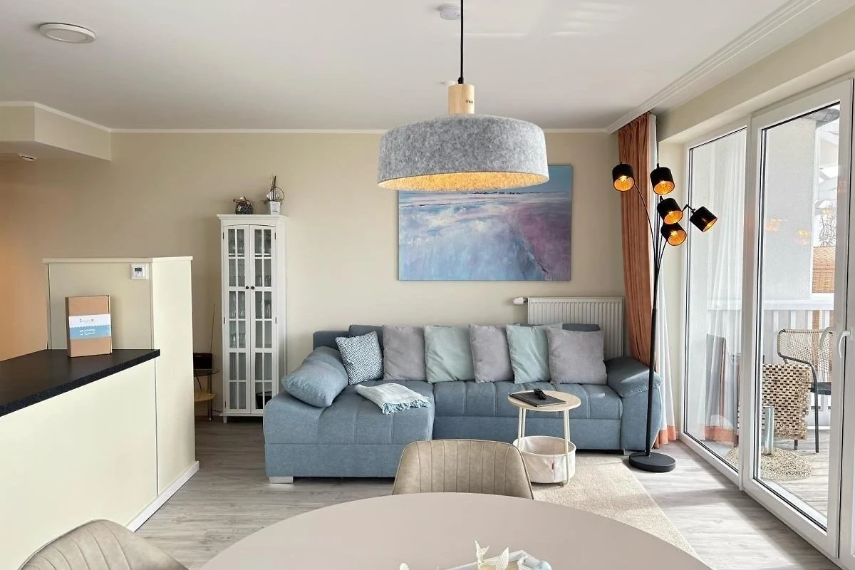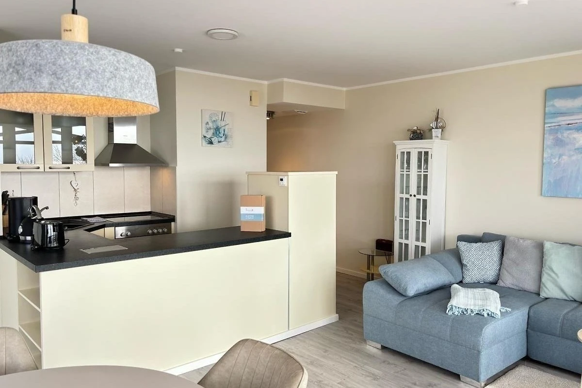 Urlauben Sie auf grosszügigen 60 m² (4. Etage) mit Balkon und tollem Blick zum Meer. Das grosse Wohn-Esszimmer ist mit einer gemütlichen Sofaecke und Flatscreen-TV ausgestattet. Im Essbereich finden bequem vier Personen Platz zum Schlemmen. Vom Wohnzimmer aus gelangen Sie auf den Balkon mit traumhaften Blick zum Strand und zur Ostsee. Das Schlafzimmer verfügt über ein gemütliches Doppelbett (mit je zwei Matratzen) und einen Flatscreen-TV. Der offene Küchenbereich ist, für den Urlaubsbedarf, voll ausgestattet. Ein Backofen und ein Geschirrspüler gehören ebenso dazu, wie die Kaffeemaschine, der Wasserkocher und ein Toaster. Geschirr und Besteck sind ausreichend vorhanden. Das Badezimmer ist mit einer Dusche mit Glastrennwand ausgestattet, ausserdem steht hier noch eine eigene Sauna und Badewanne zur kostenfreien Nutzung.