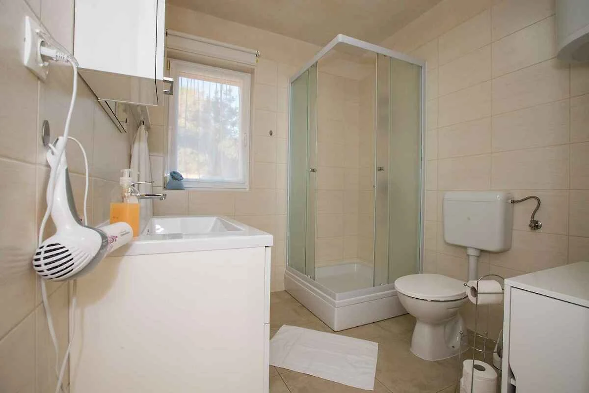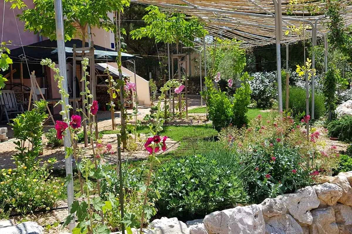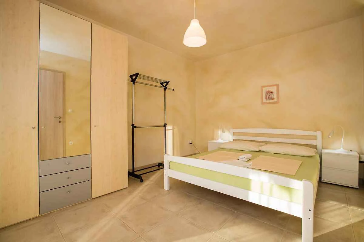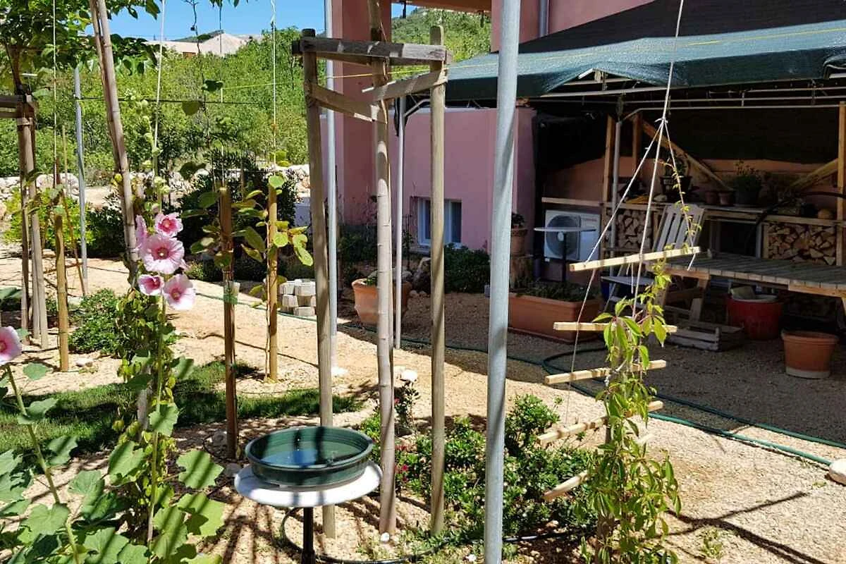 Rab, Ortsteil Barbat. Die Ferienwohnung befindet sich auf einem geschlossenen Gartengrundstück mit Wiese, Blumen, Sträuchern und Bäumen, von einem Zaun begrenzt. Der Vermieter wohnt ständig im Haus, nutzt jedoch einen separaten Eingang. Die Zufahrt erfolgt über eine Nebenstrasse (asphaltiert). Parkplatz auf dem Grundstück.